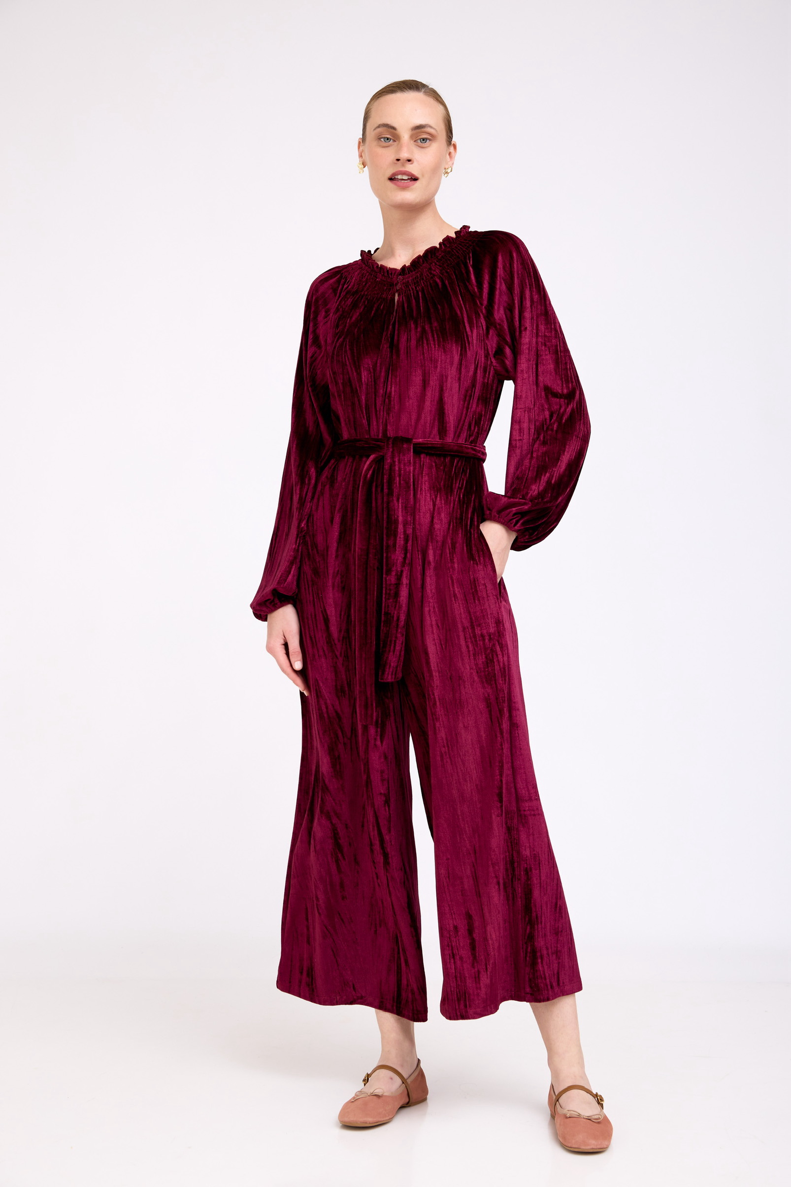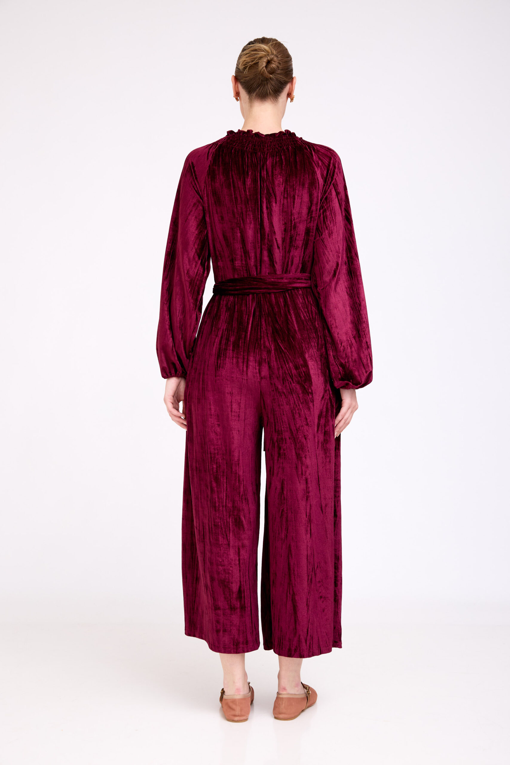 אוברול קטיפתי, מבריק ואלגנטי בגזרה רחבה, רך ונעים ומונח יפה על הגוף.