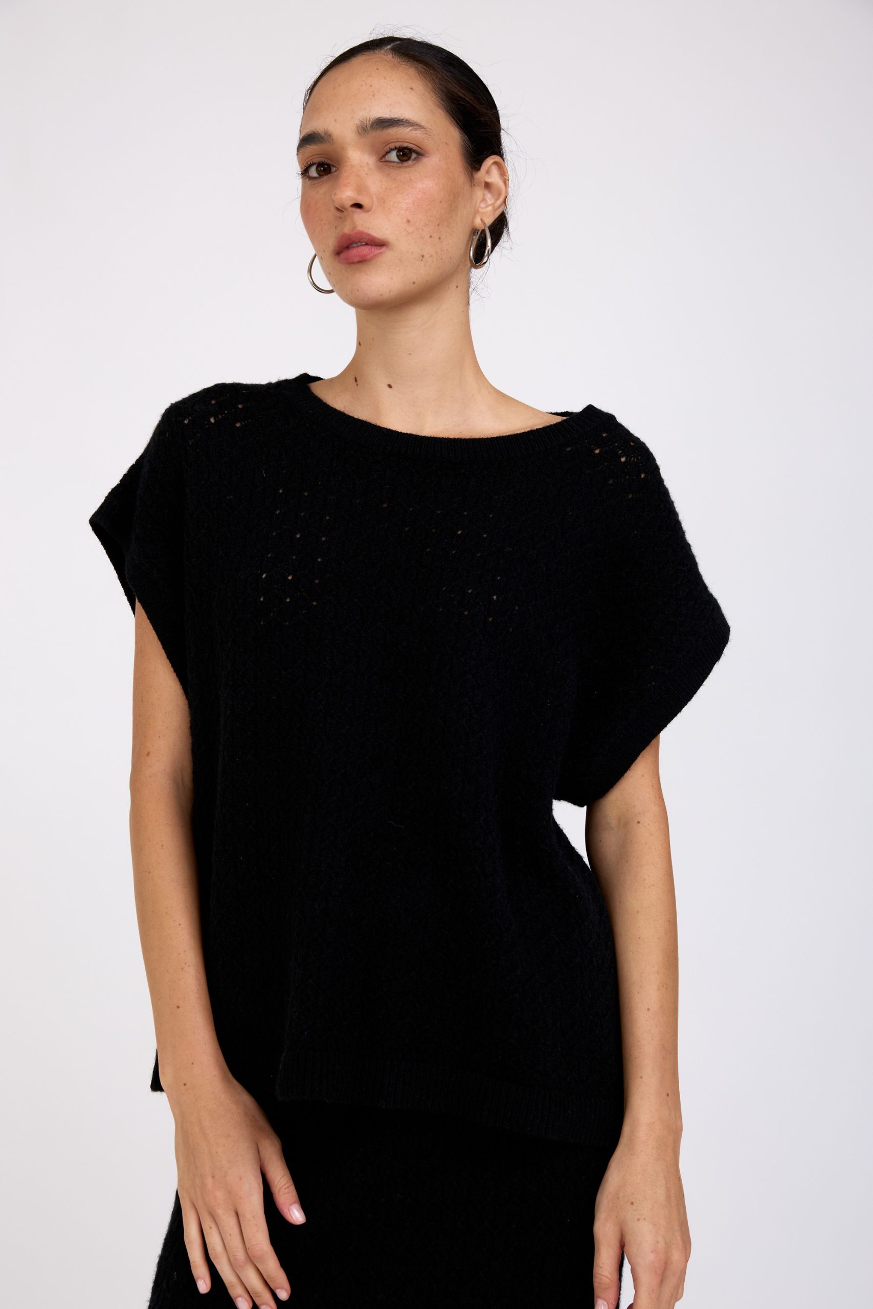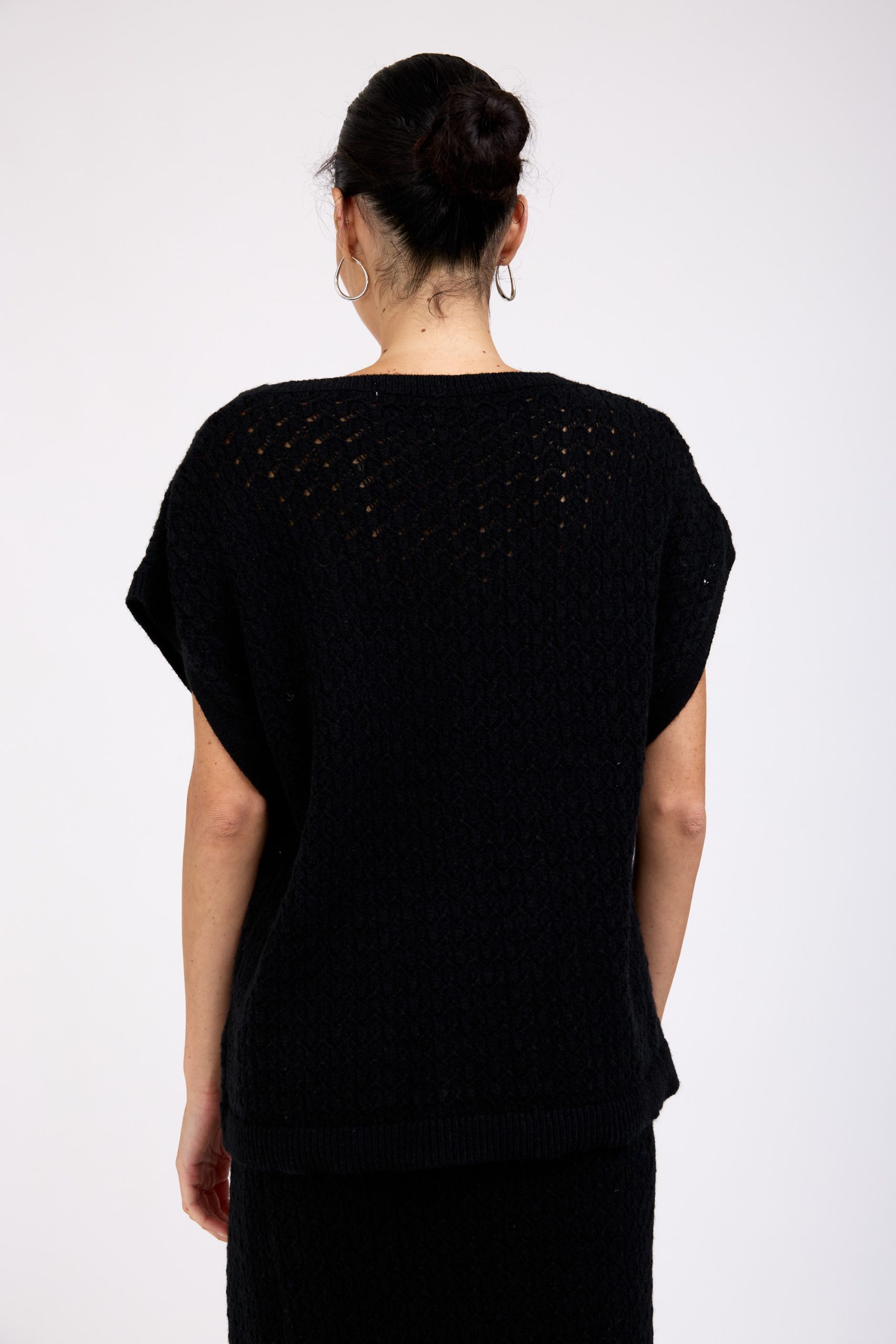 אפודה סרוגה וקלילה עם שרוול קצר- שמוסיפה טאץ’ של סטייל סתווי לכל לוק. בגוון שחור עמוק!