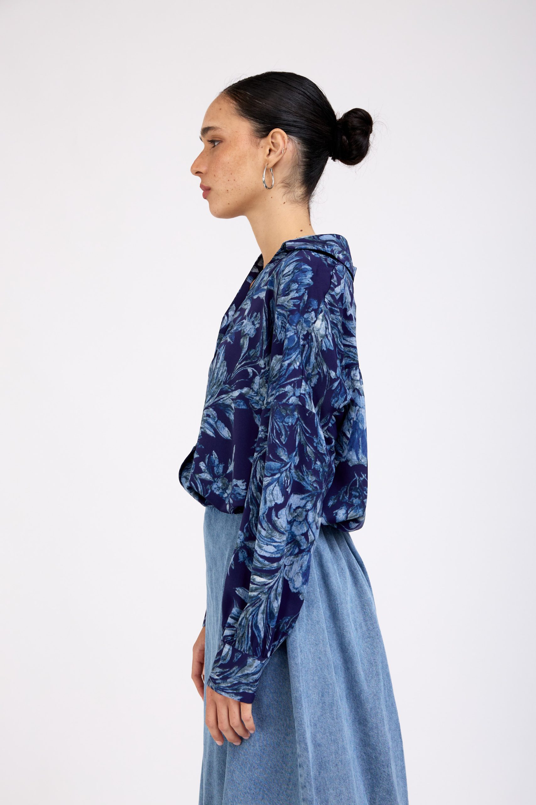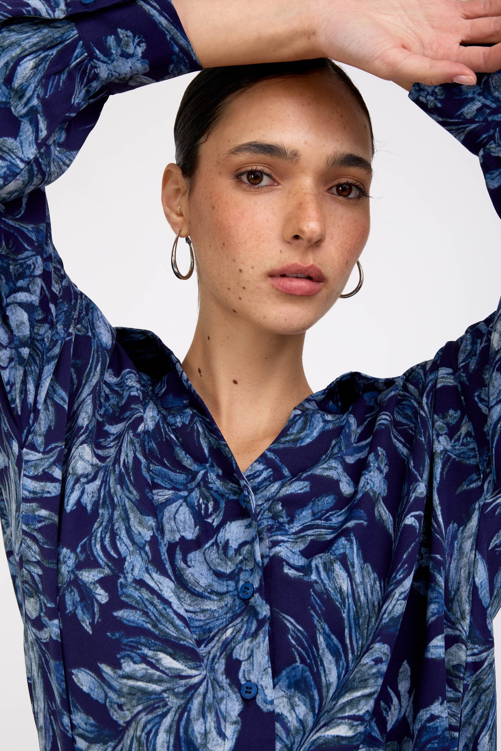 חולצה שמשלבת נוחות יומיומית עם מראה מתוחכם – בהדפס כחול ואצילי במיוחד וכפתורים לכל האורך! מתאימה מבוקר עד ערב.