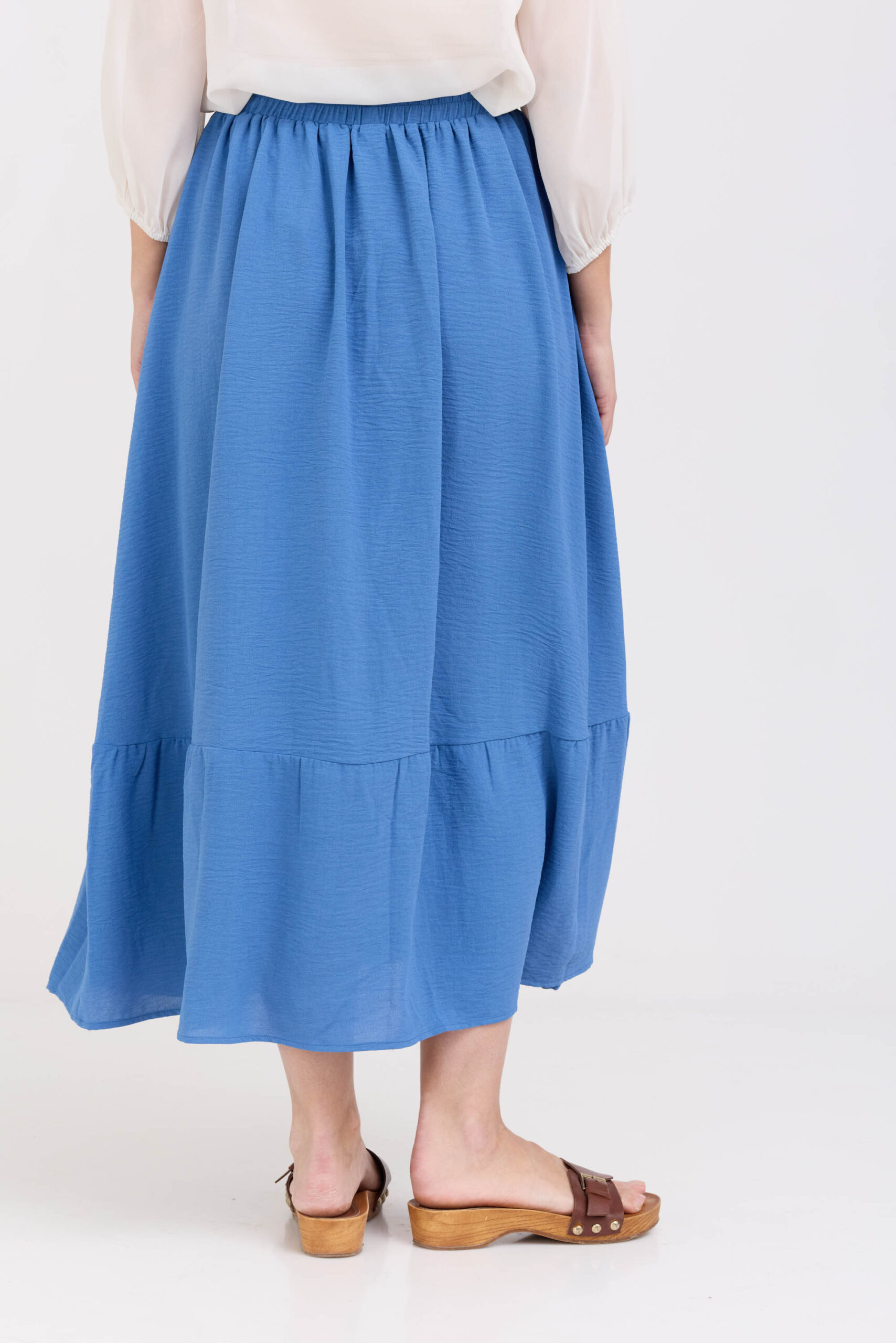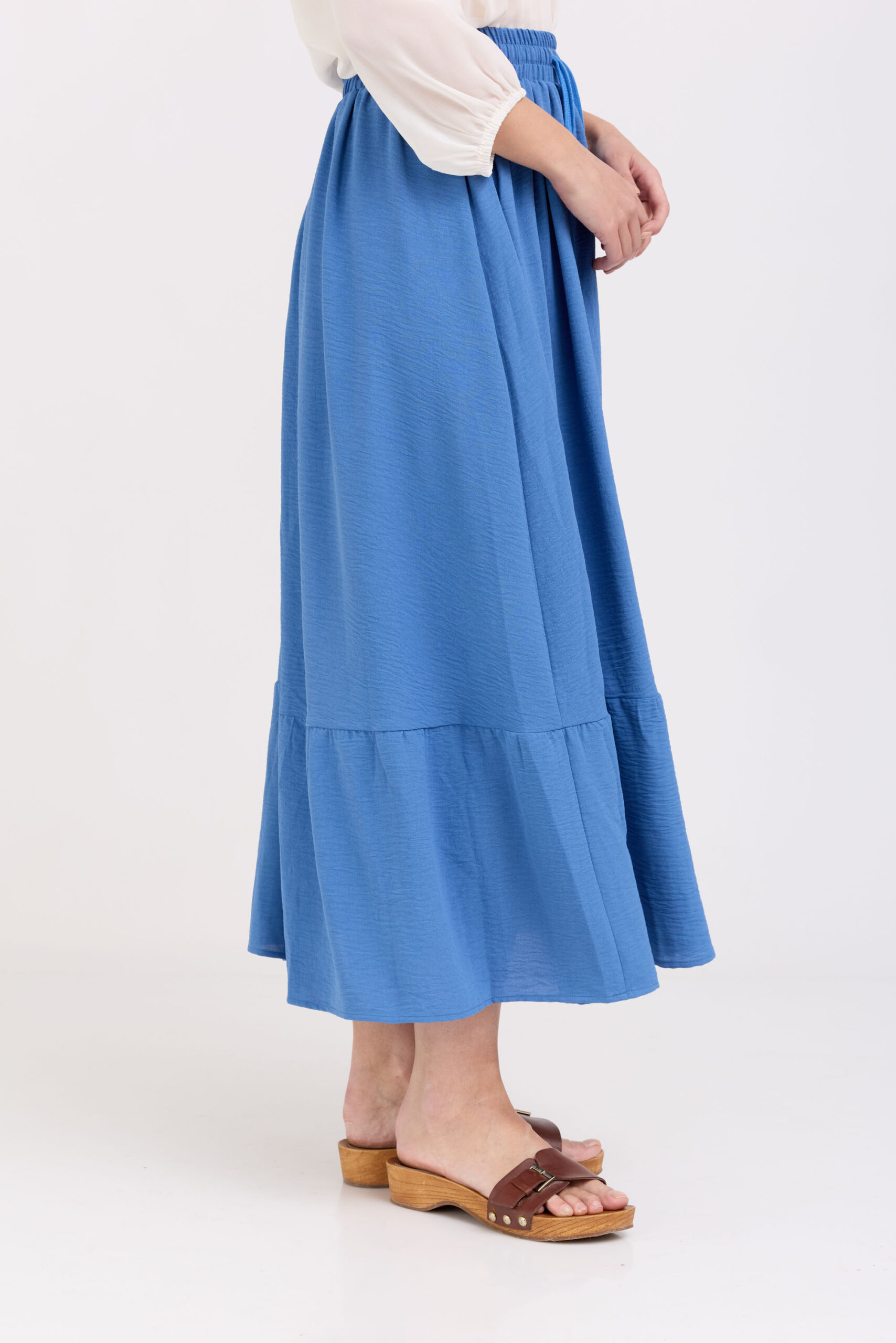 החצאית מעוצבת בגוון כחול ג'ינס בהיר,