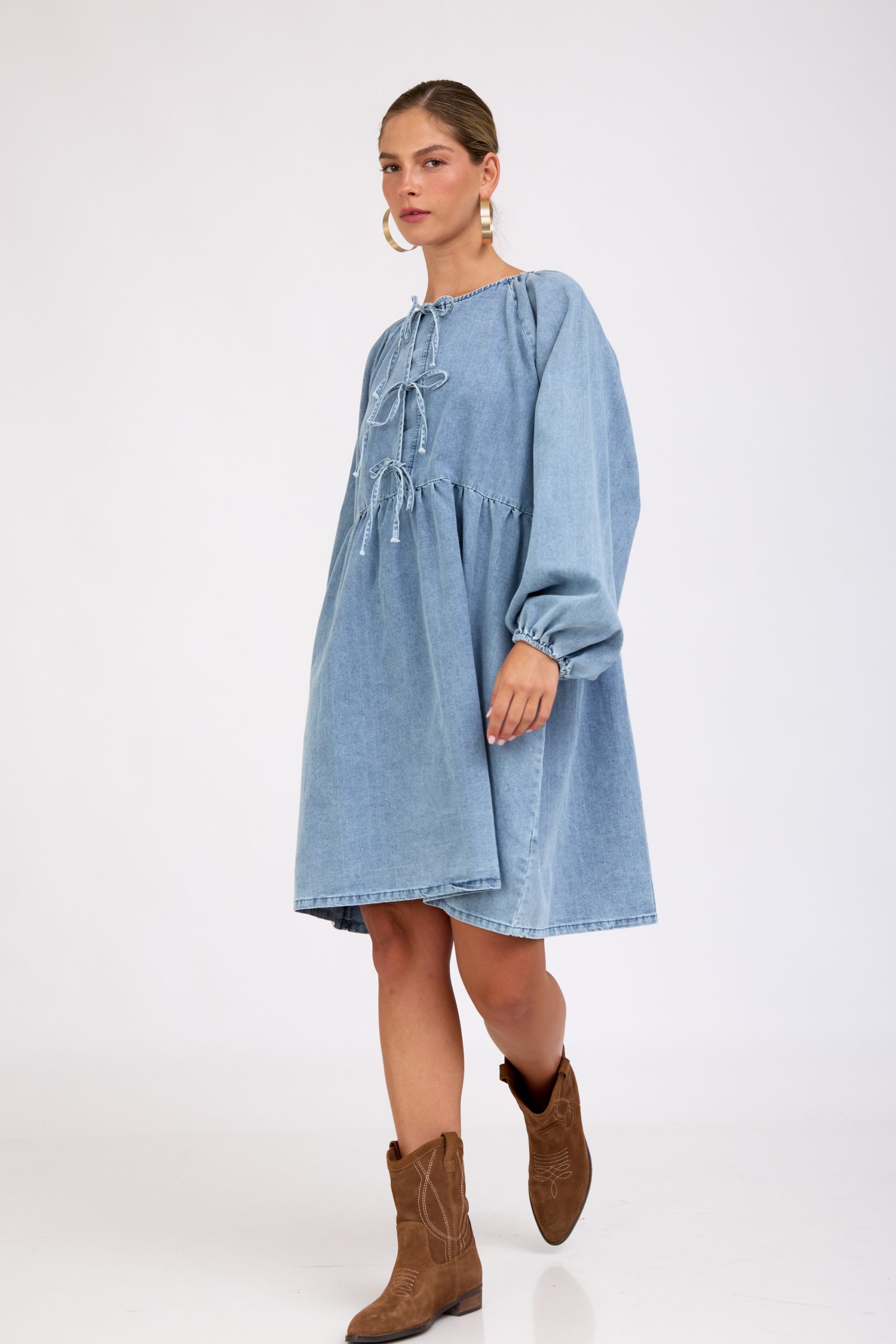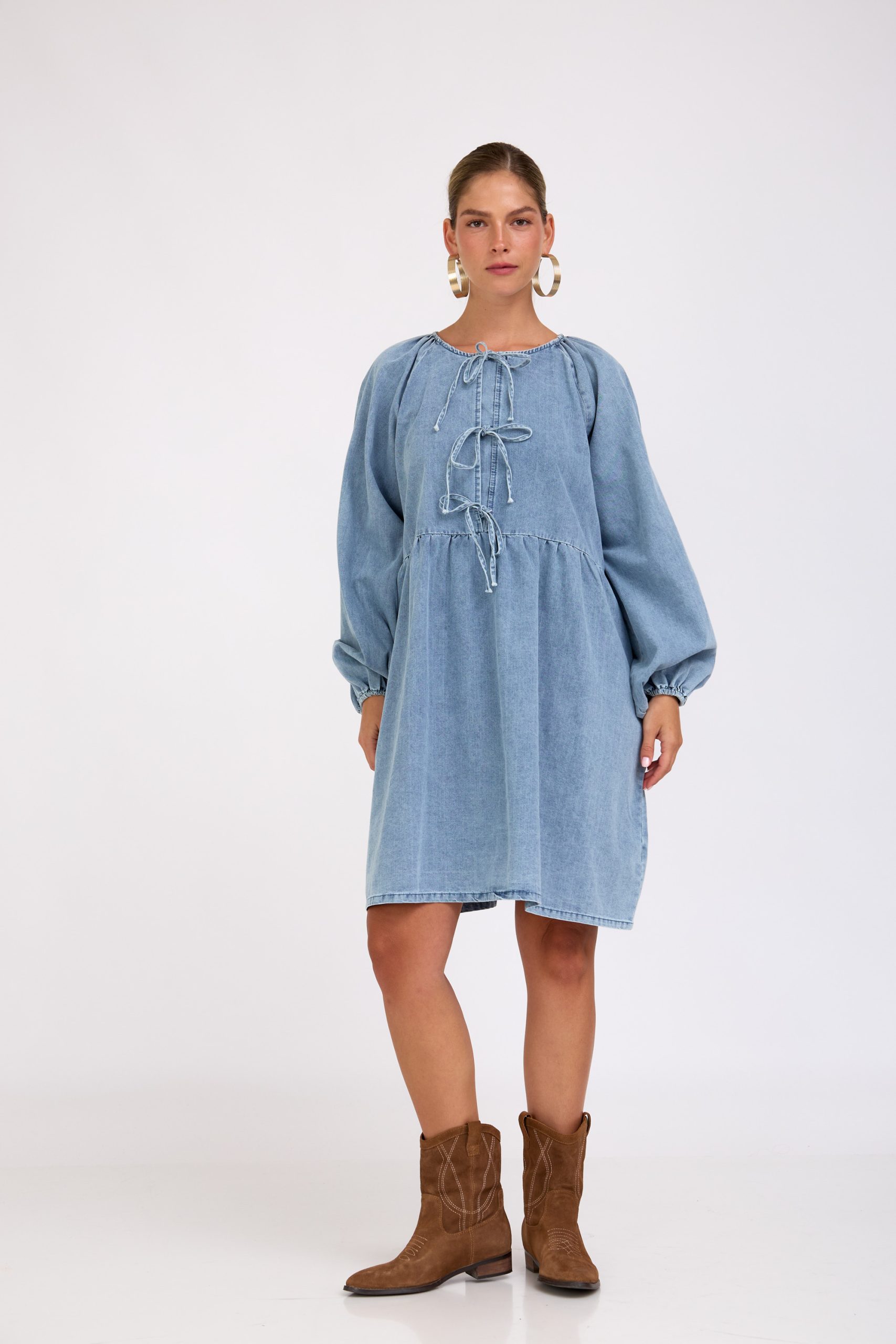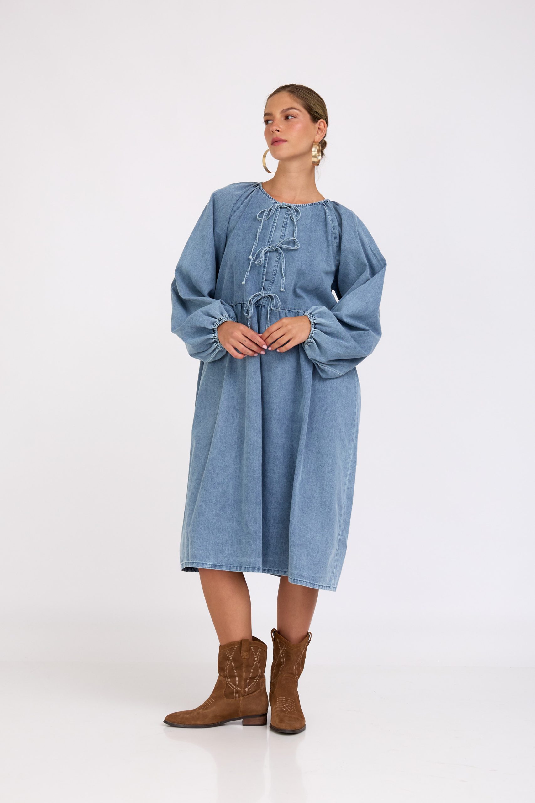לשמלה שלושה שרוכים לקשירה רומנטית מלפנים.