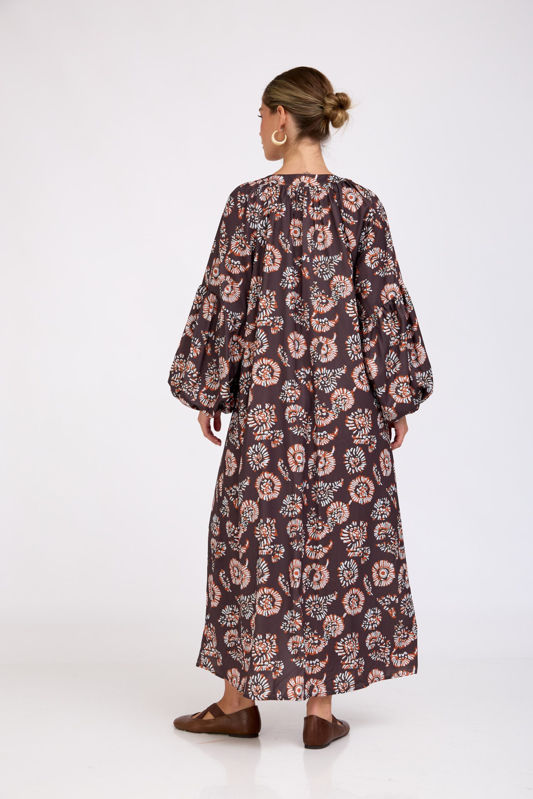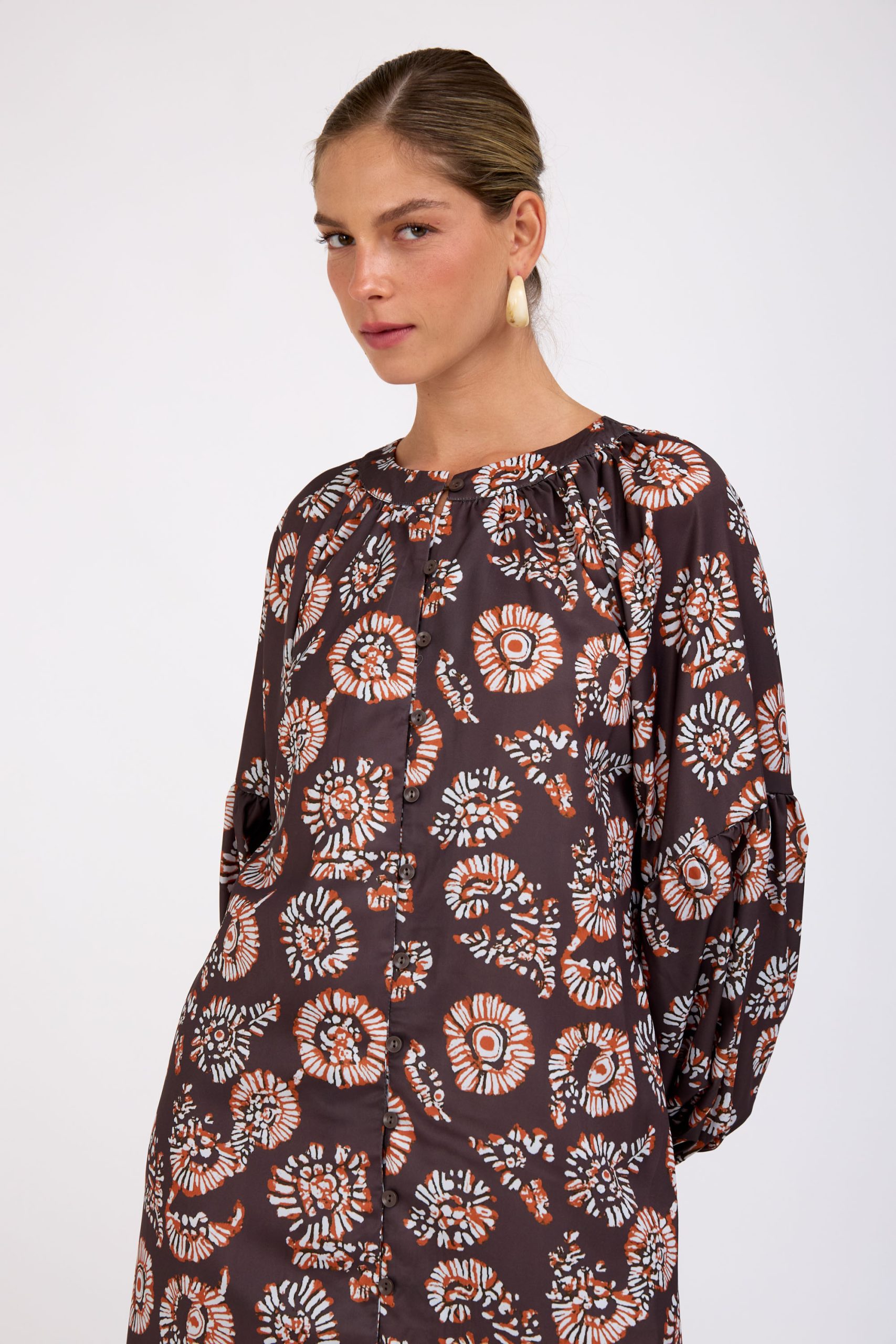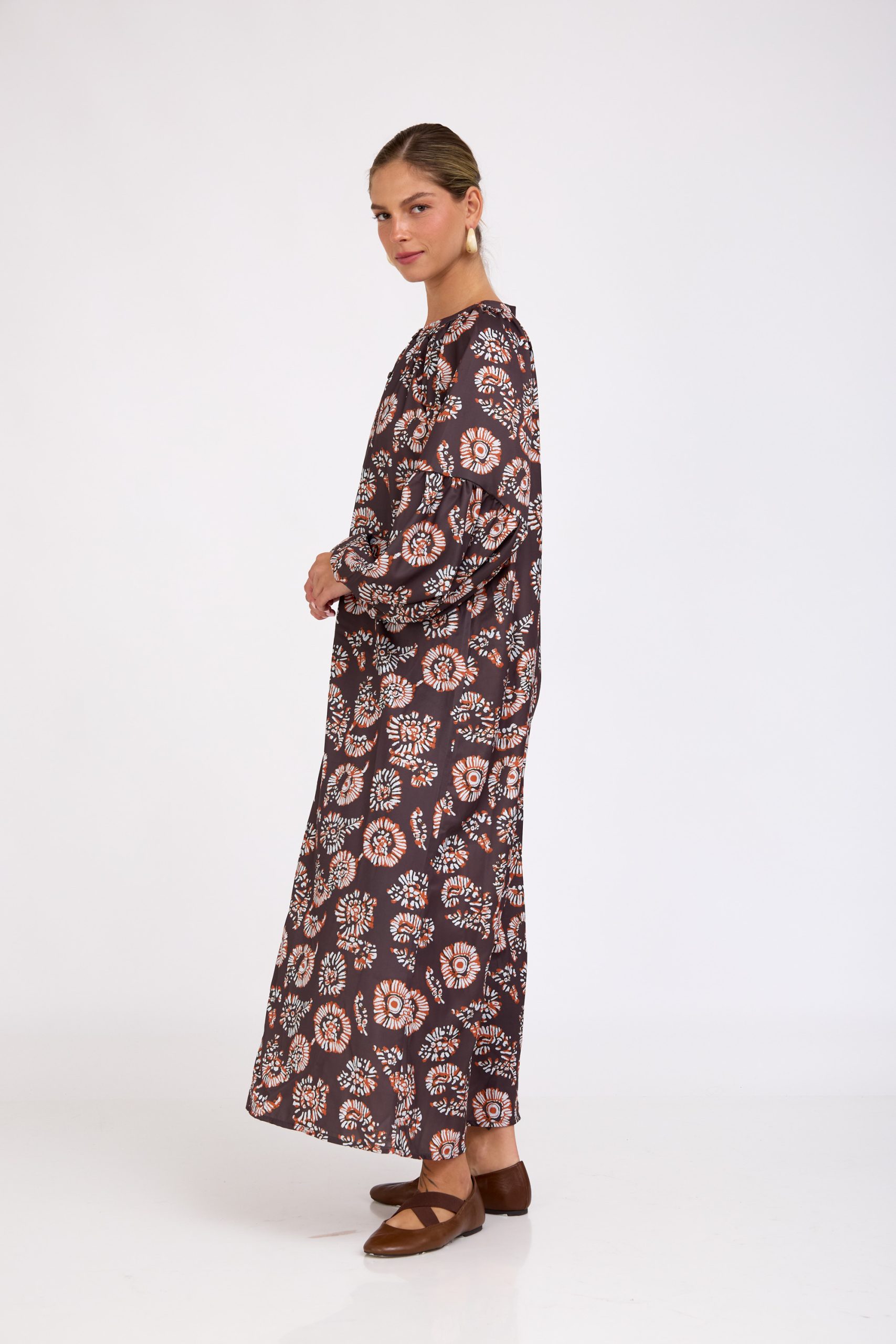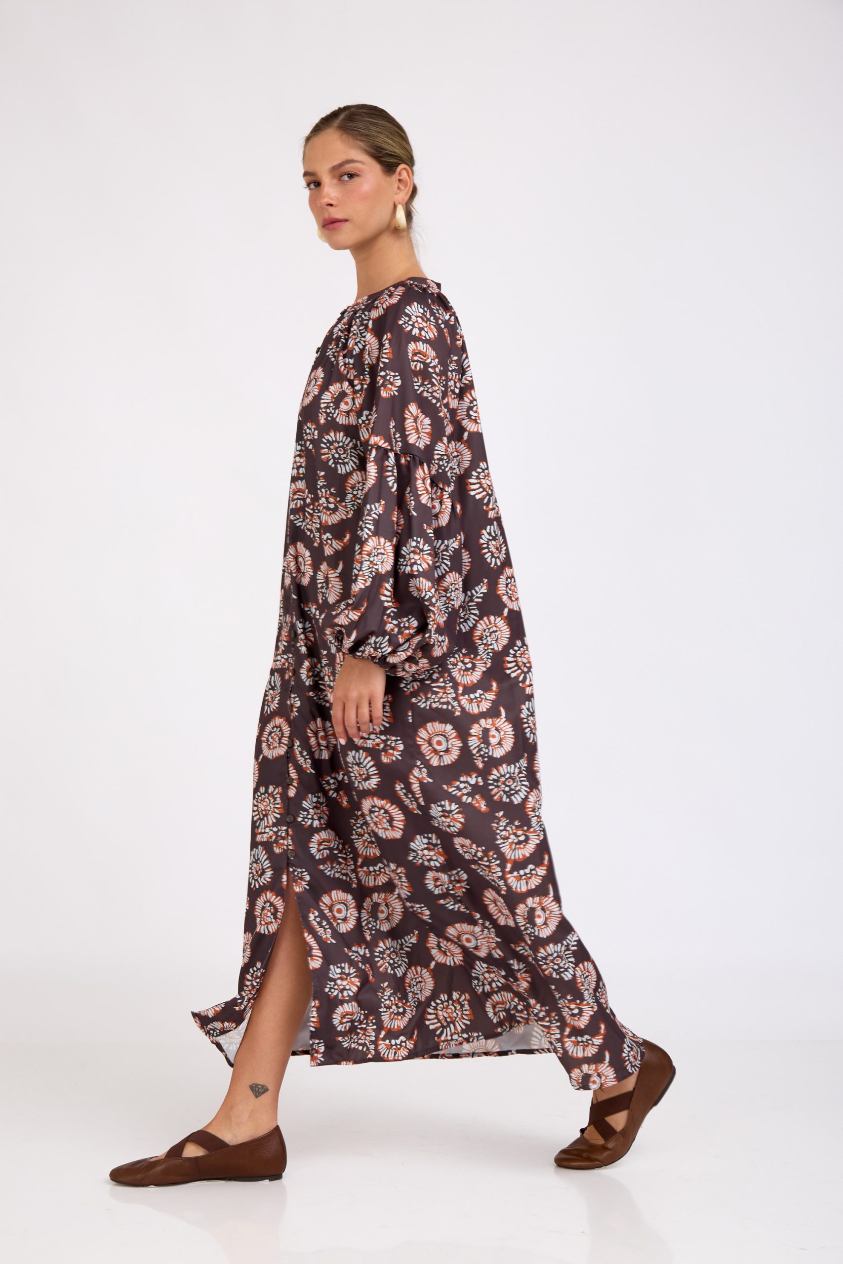 שמלת מקסי מדהימה בגזרה נשפכת והדפס יפהפה. כפתורים לכל האורך ושרוול עשיר ומלא נפח! לוק עם נוכחות טבעית ומרשימה בכל כניסה!