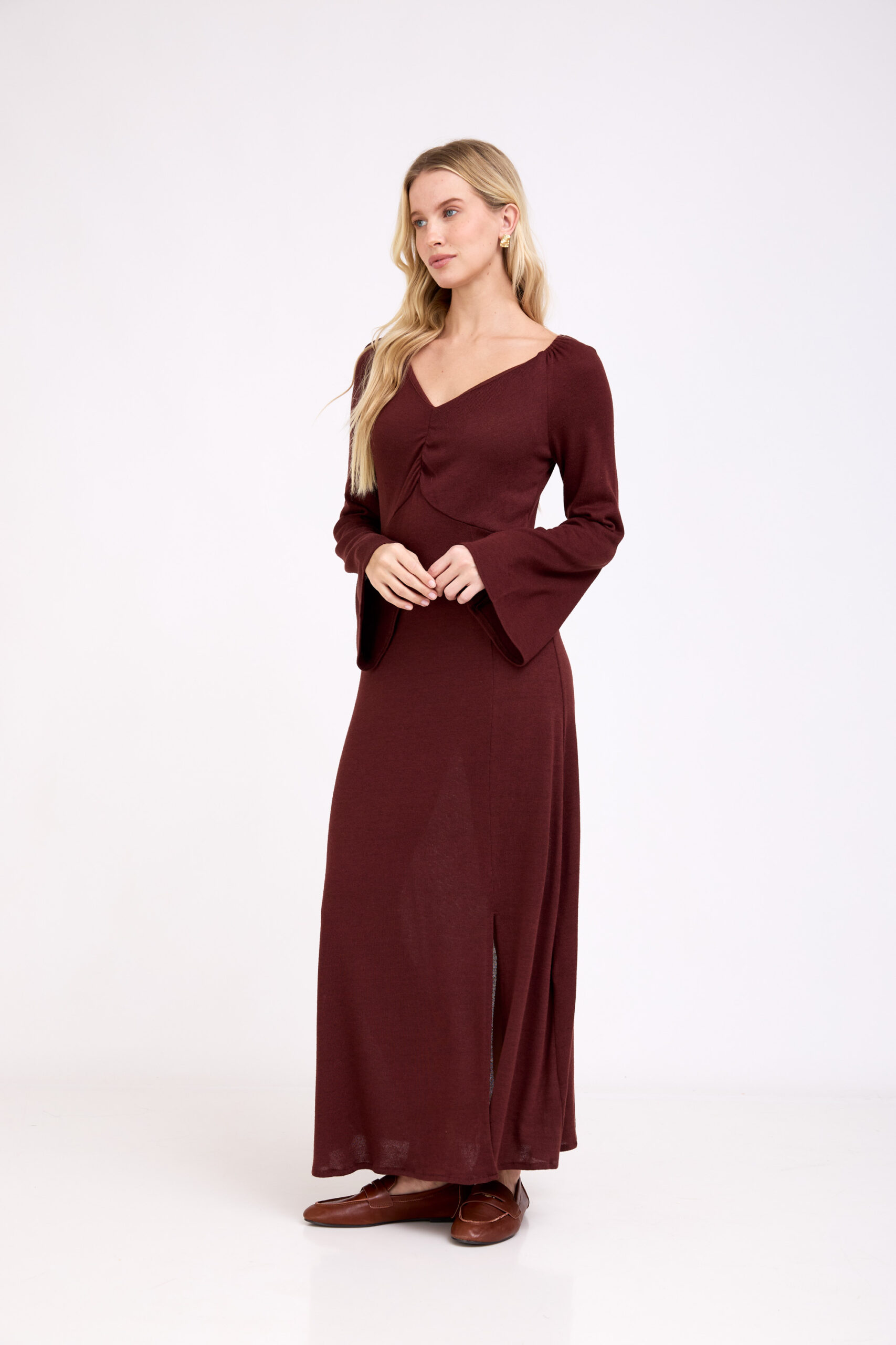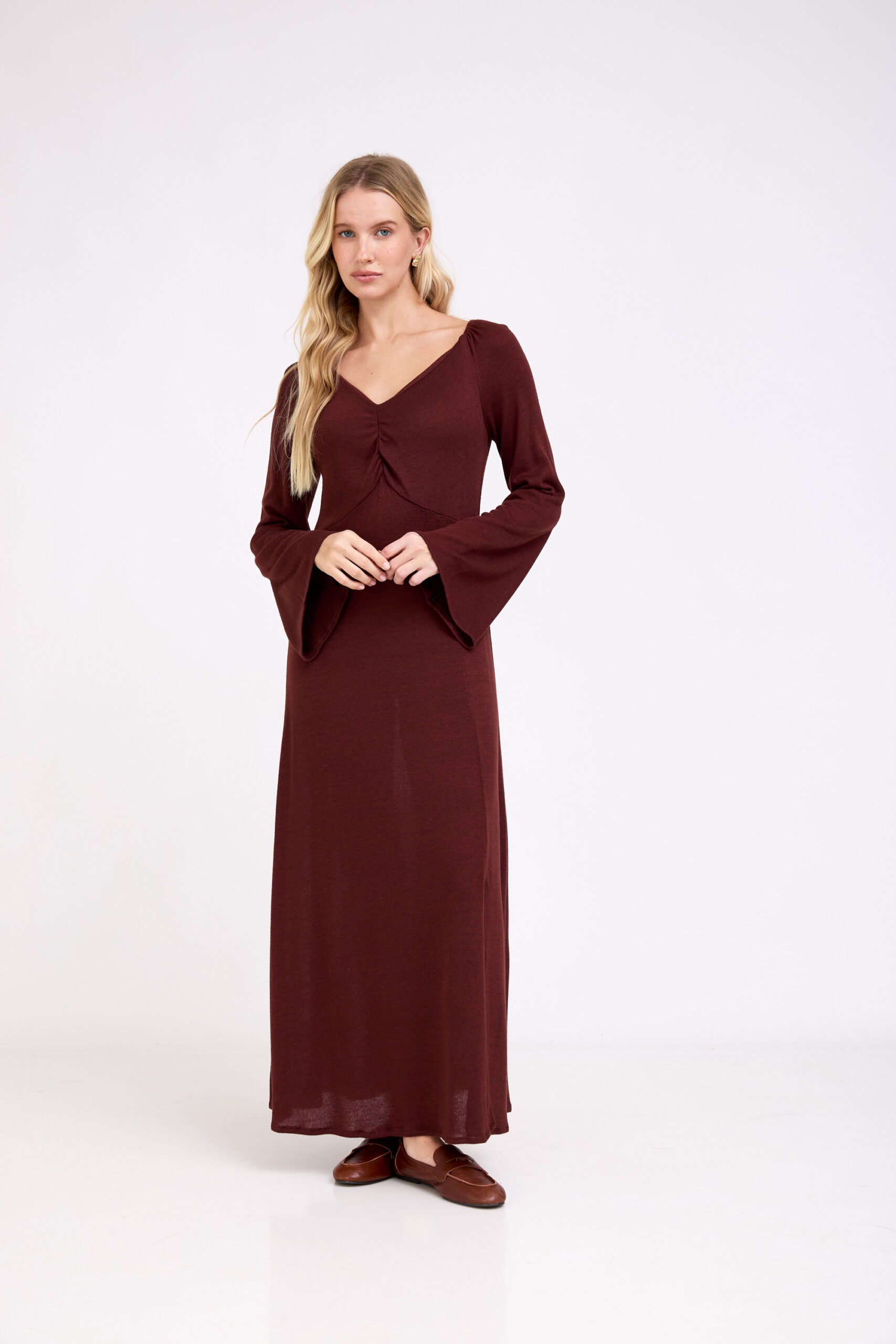 • צבע: גוון חום שוקולד (Chocolate Brown) עמוק וטרנדי, שמעניק לשמלה מראה יוקרתי, חם ומתוחכם.