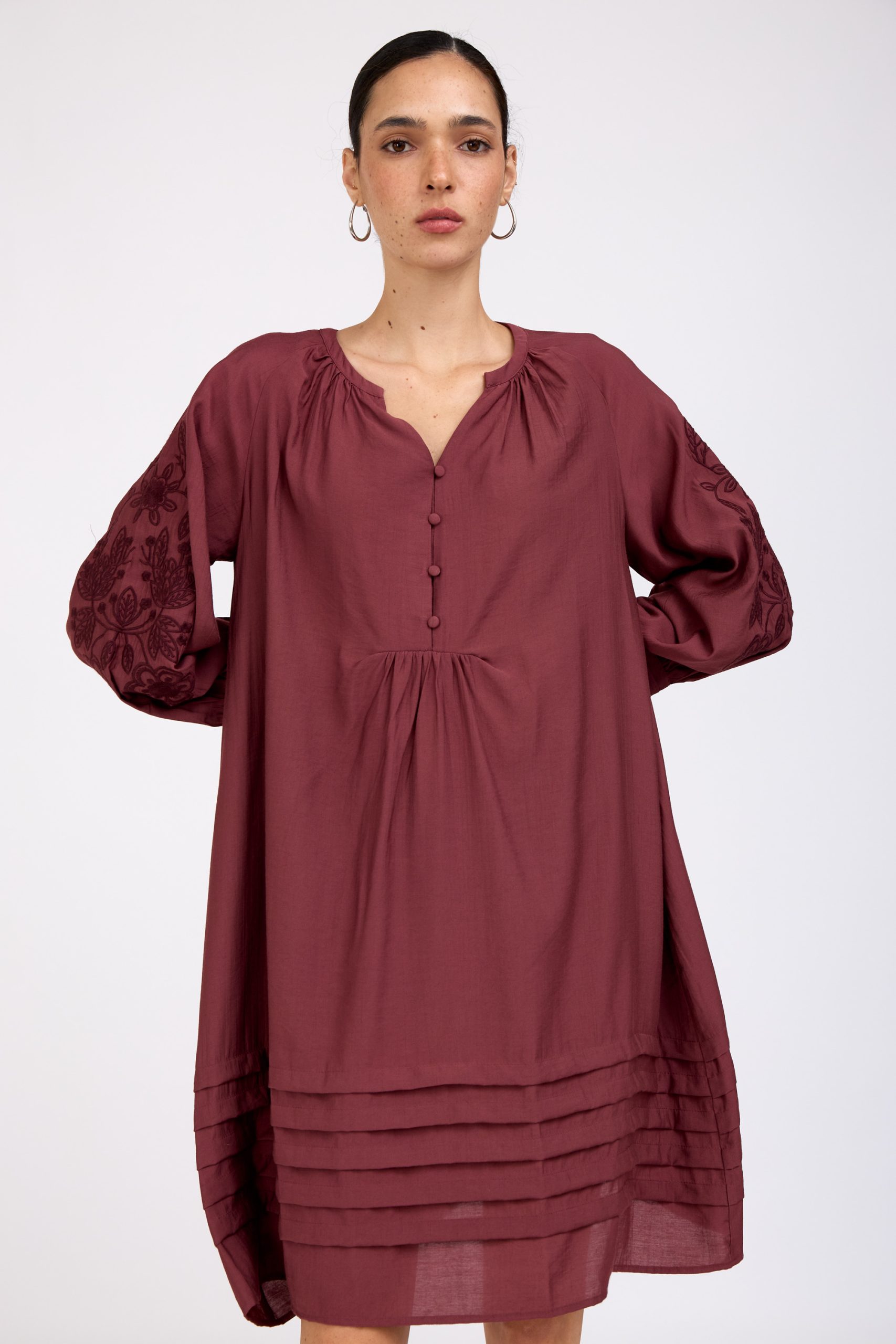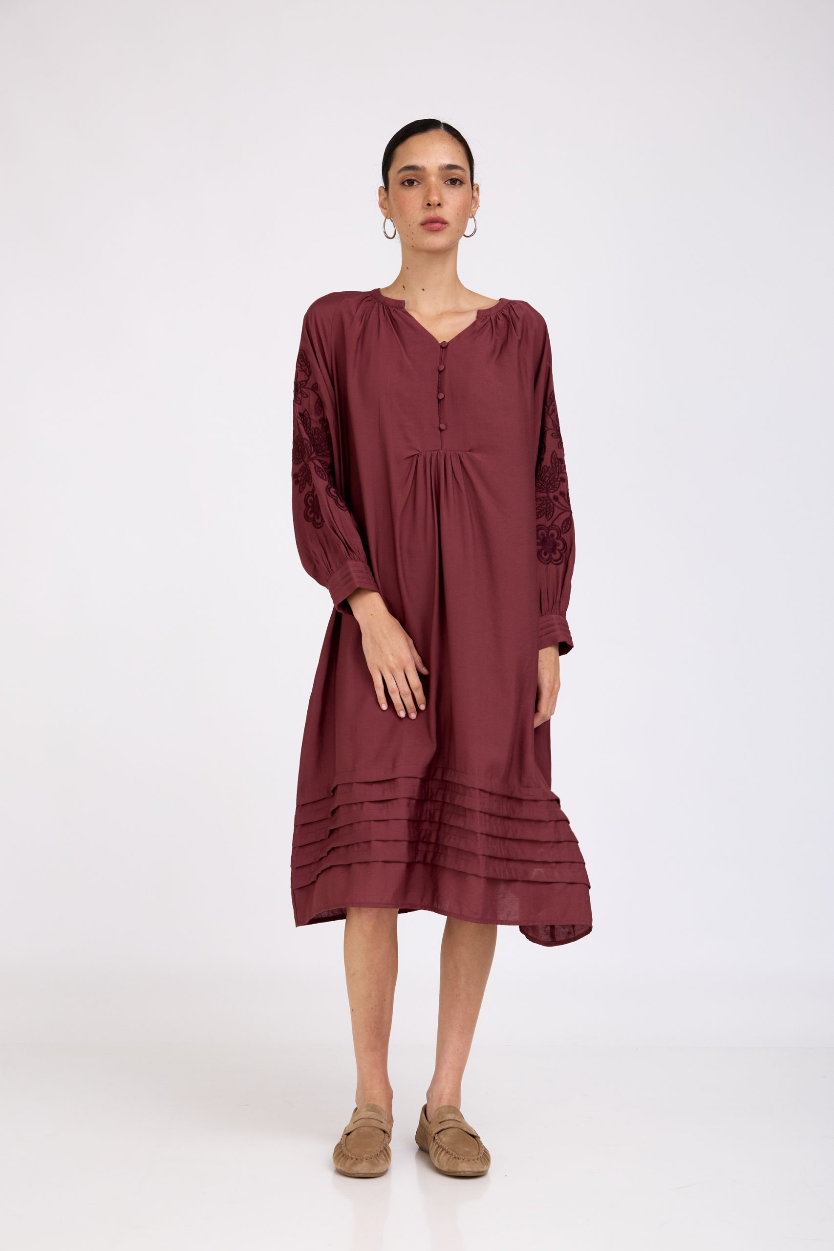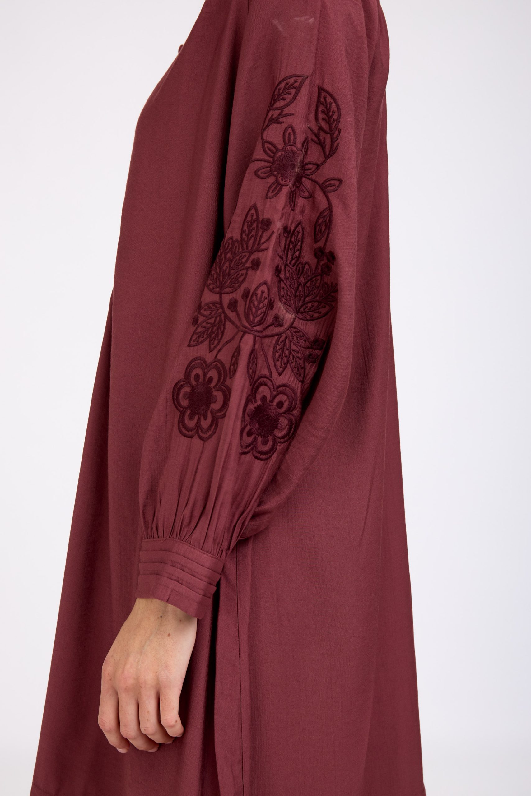 שמלה חגיגית בגוון יין עמוק, עם רקמה יפיפיה בשרוול למראה נשי ומוקפד.