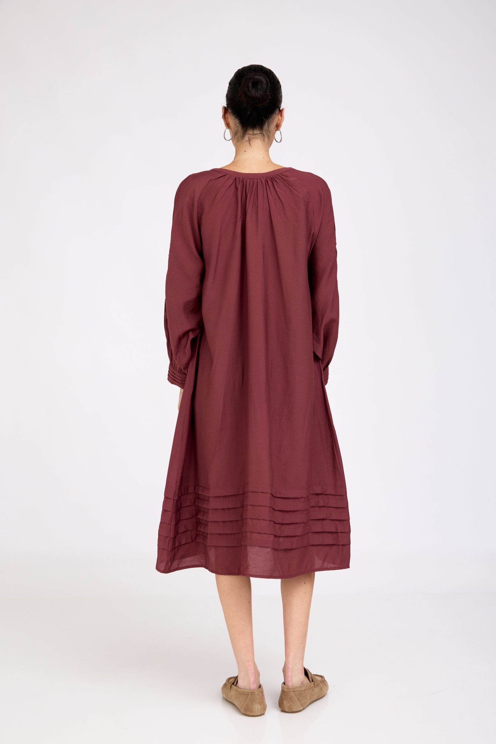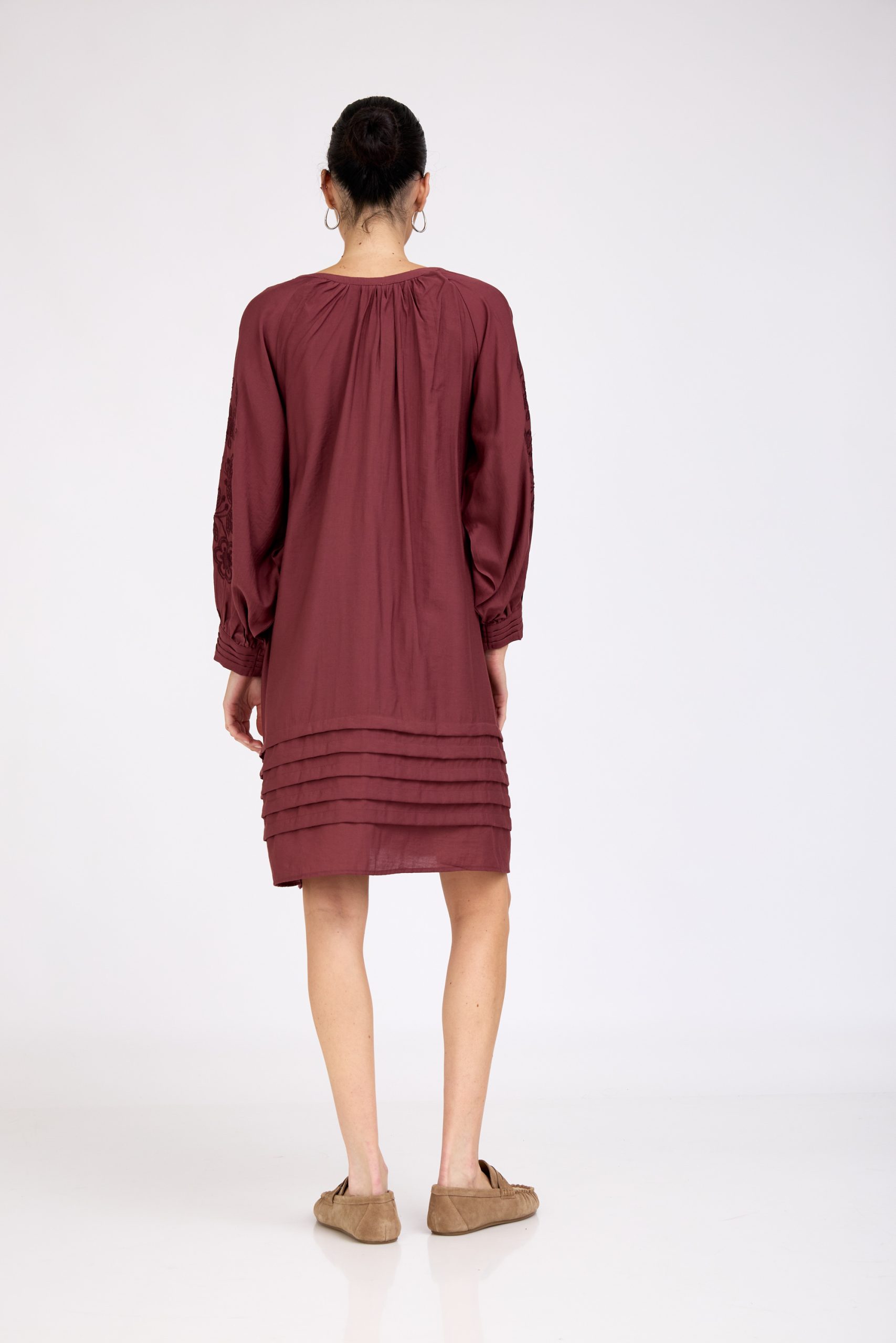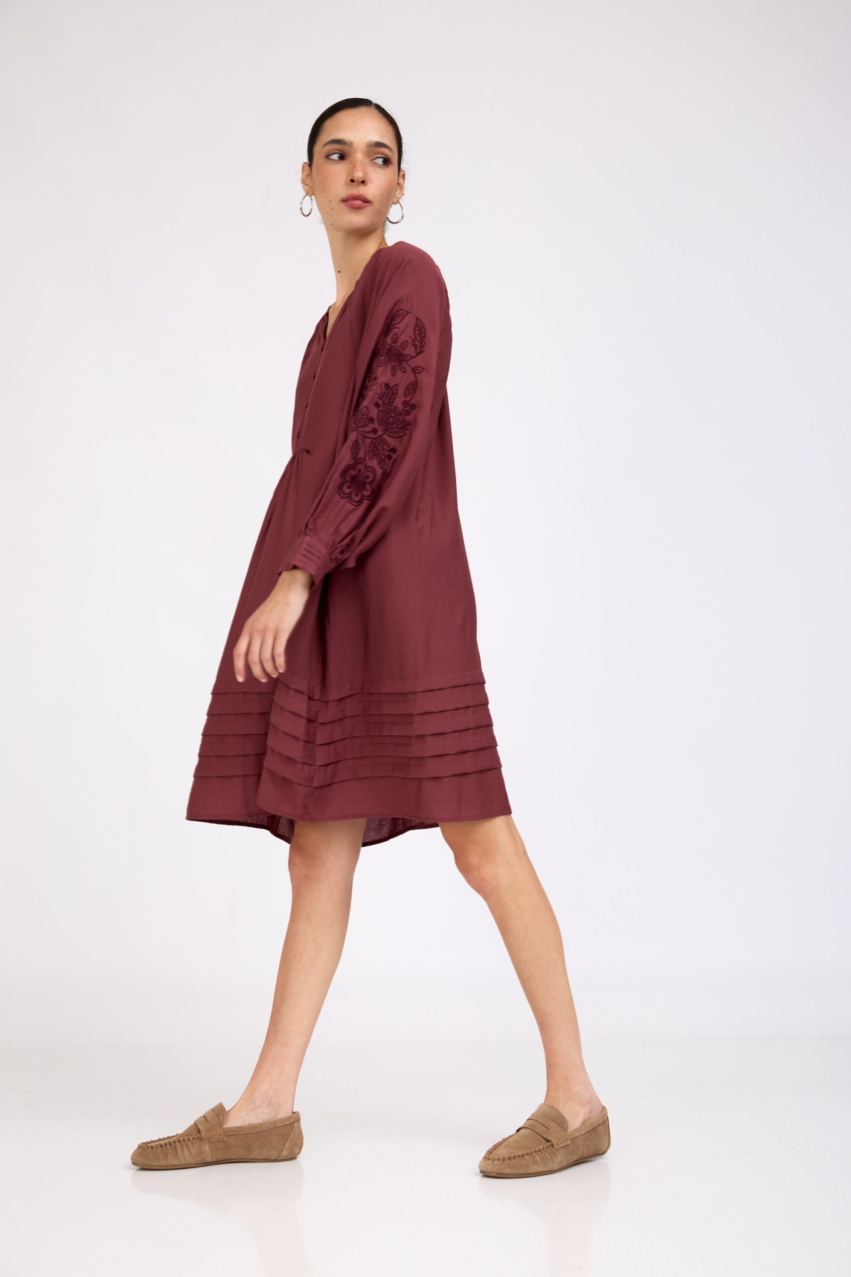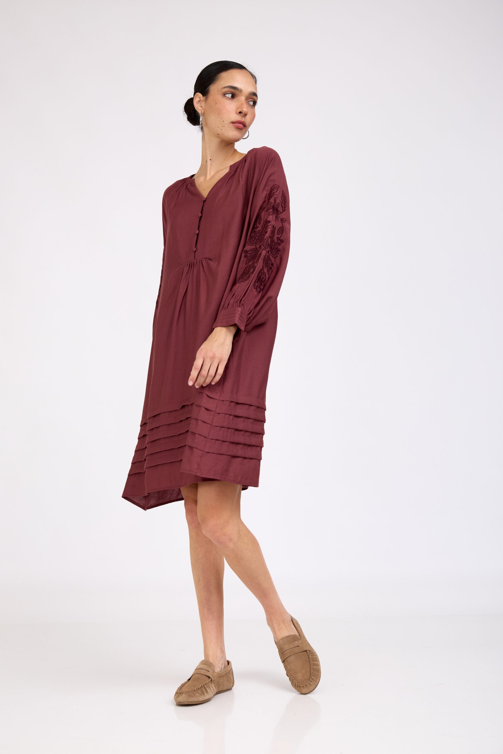 שמלה חגיגית בגוון יין עמוק, עם רקמה יפיפיה בשרוול למראה נשי ומוקפד.