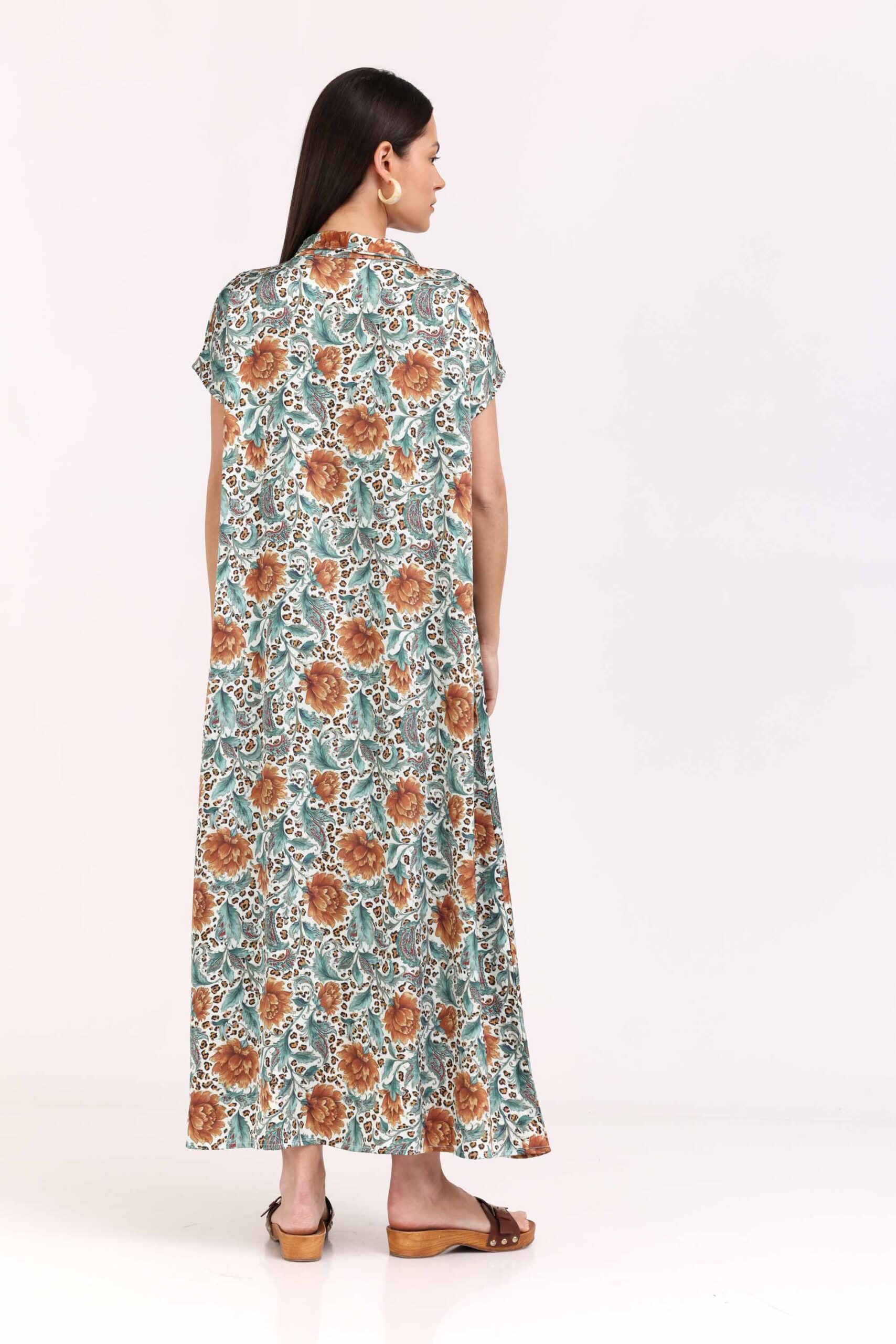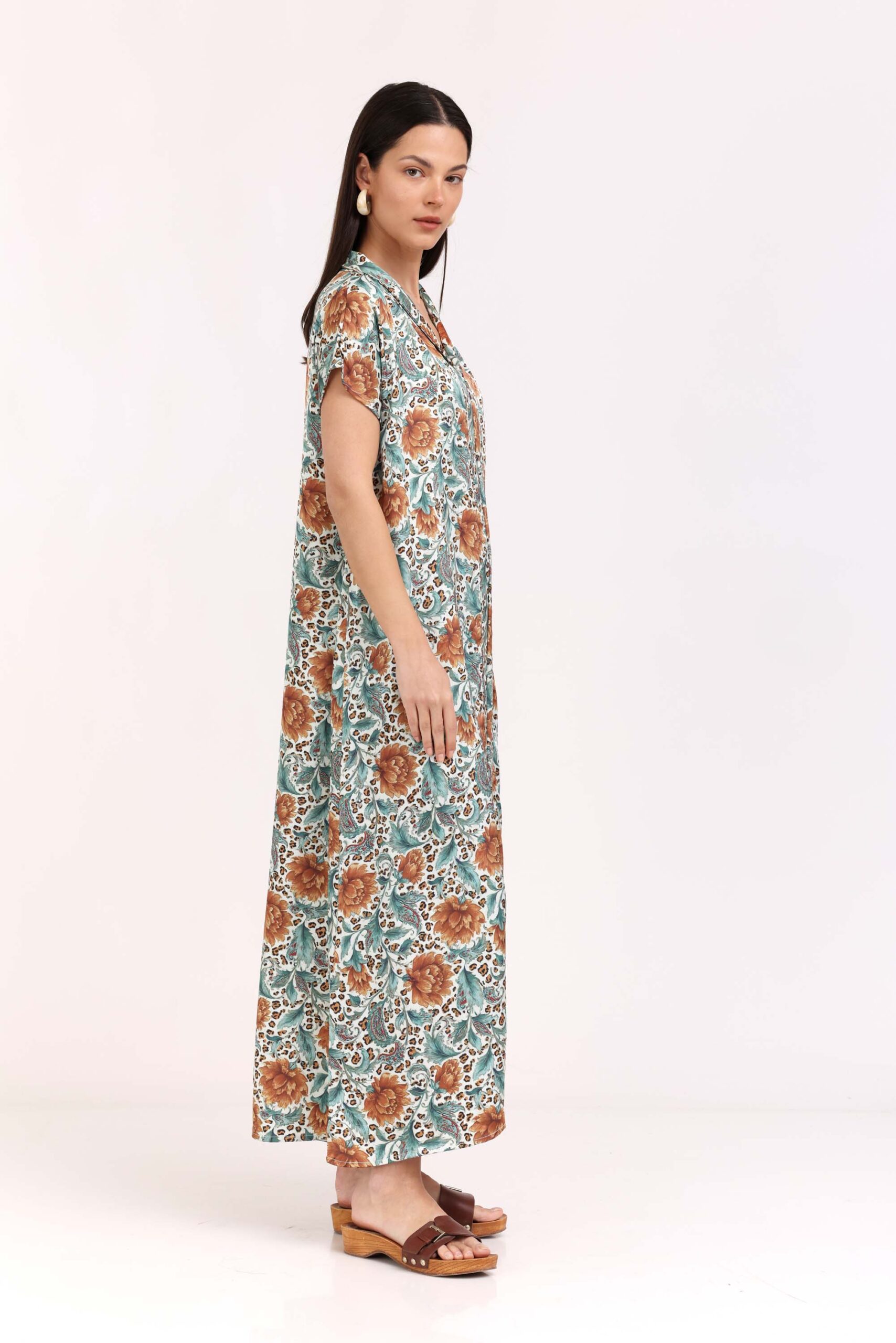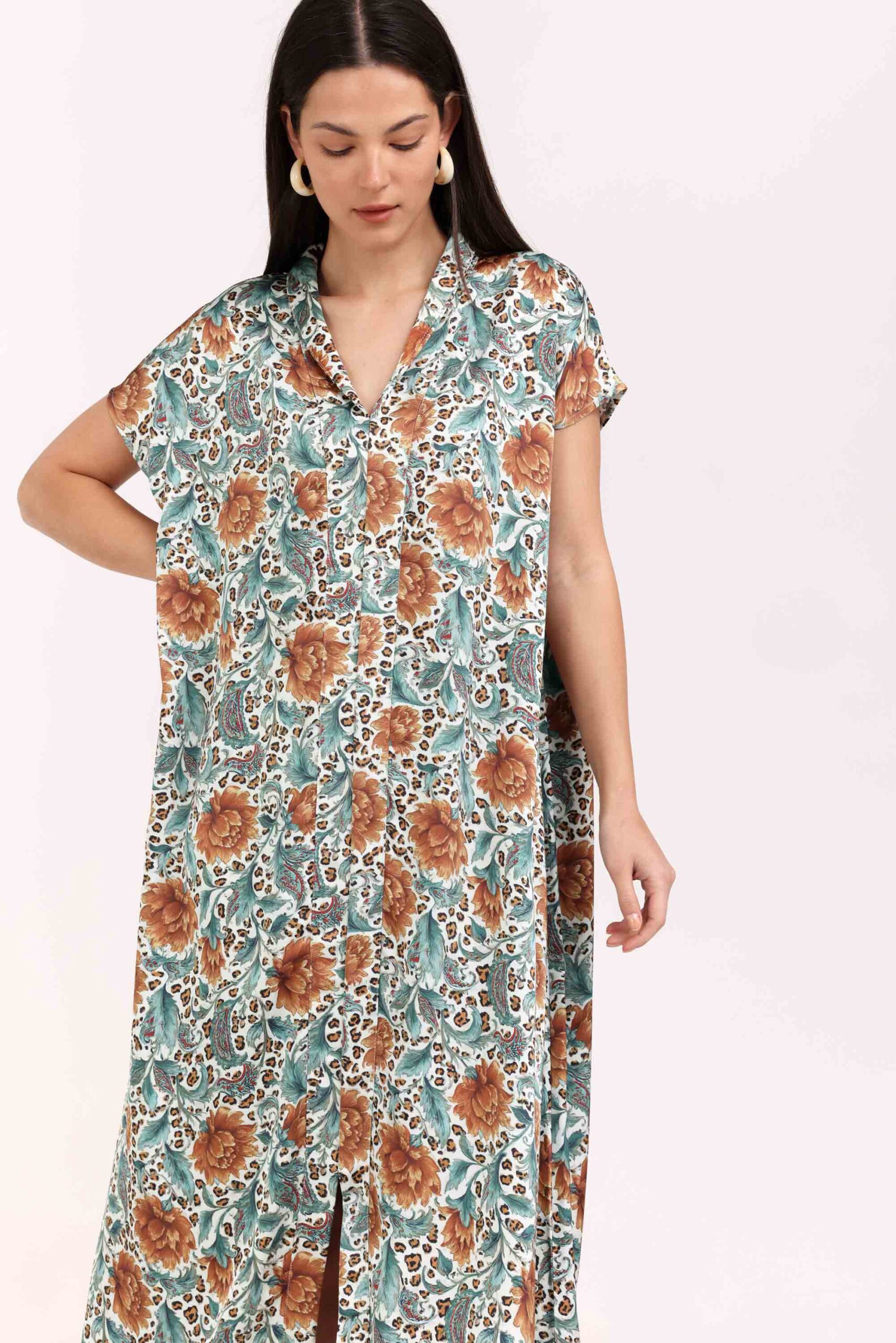 שמלת מקסי עם הדפס פרחים אתני עשיר בגווני כתום,