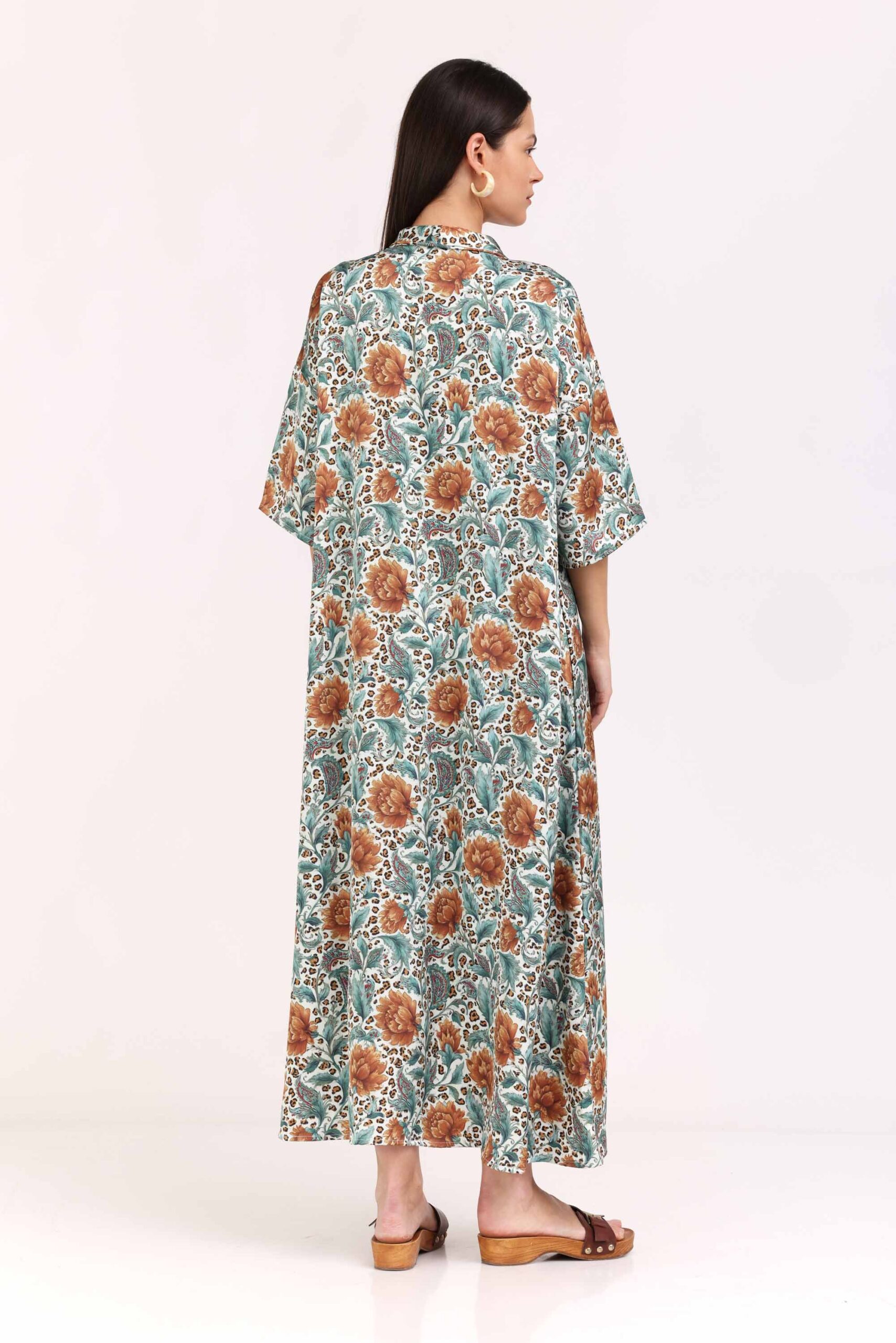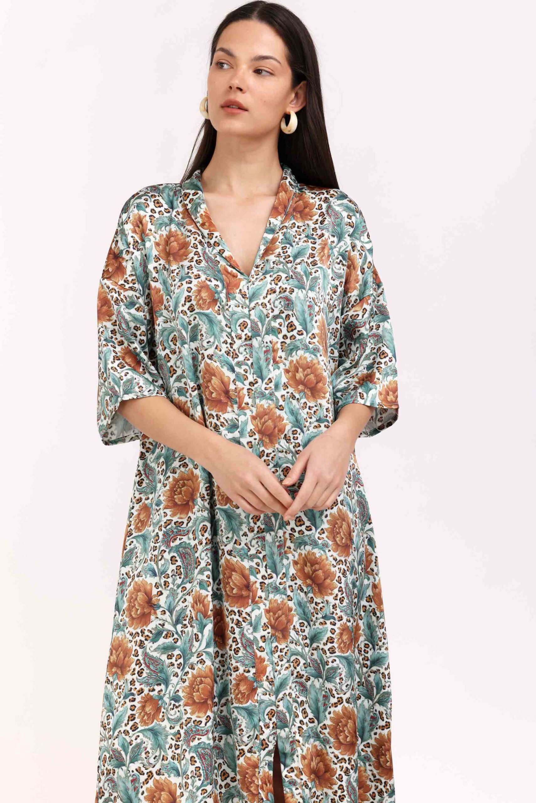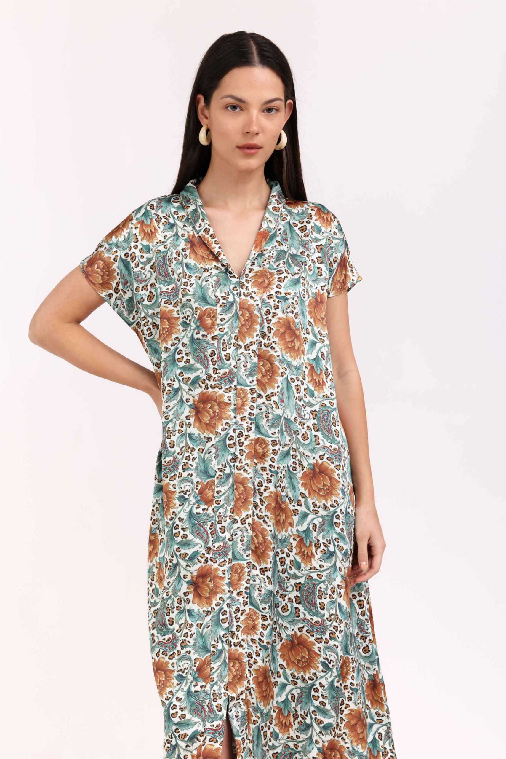שמלת מקסי עם הדפס פרחים אתני עשיר בגווני כתום,