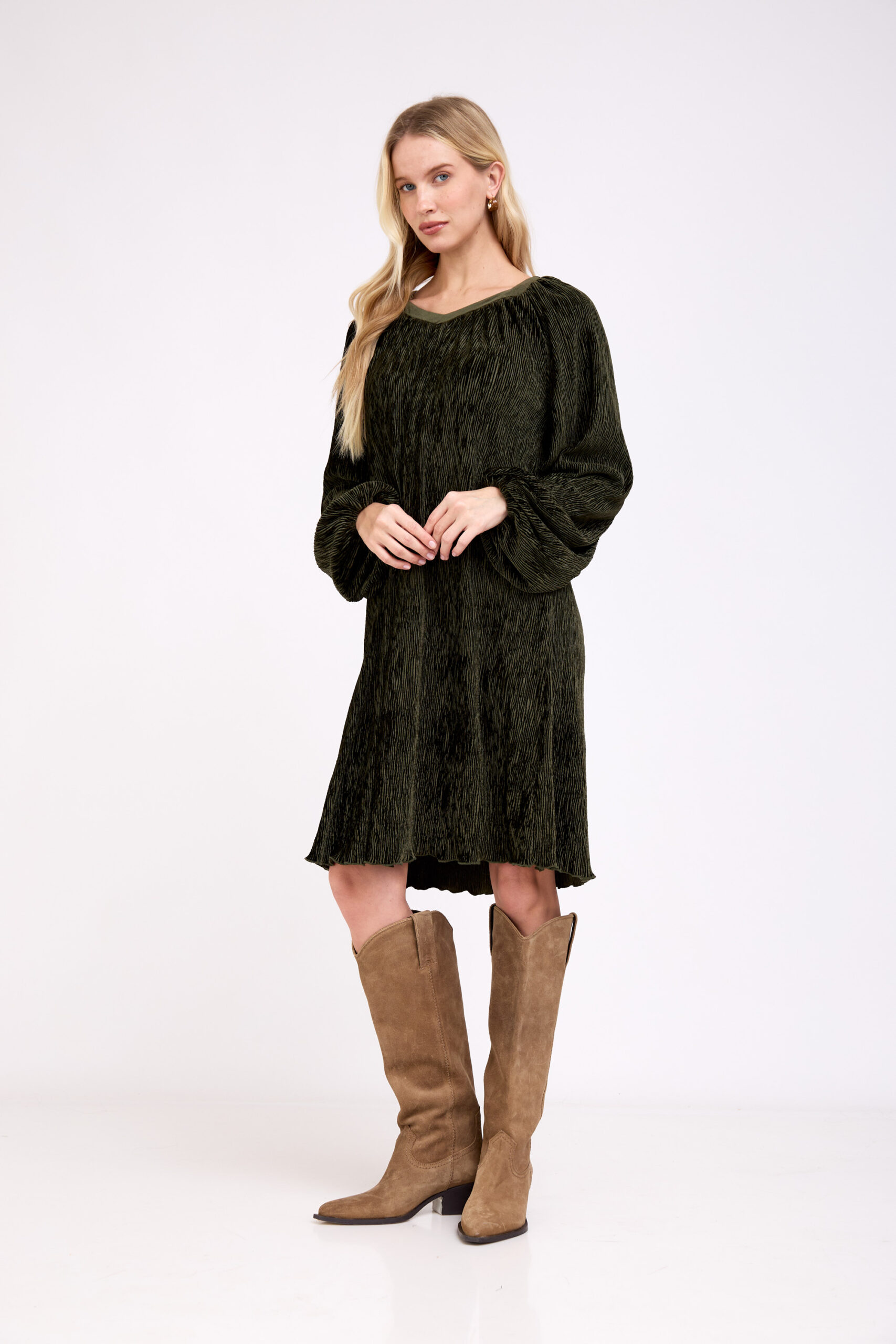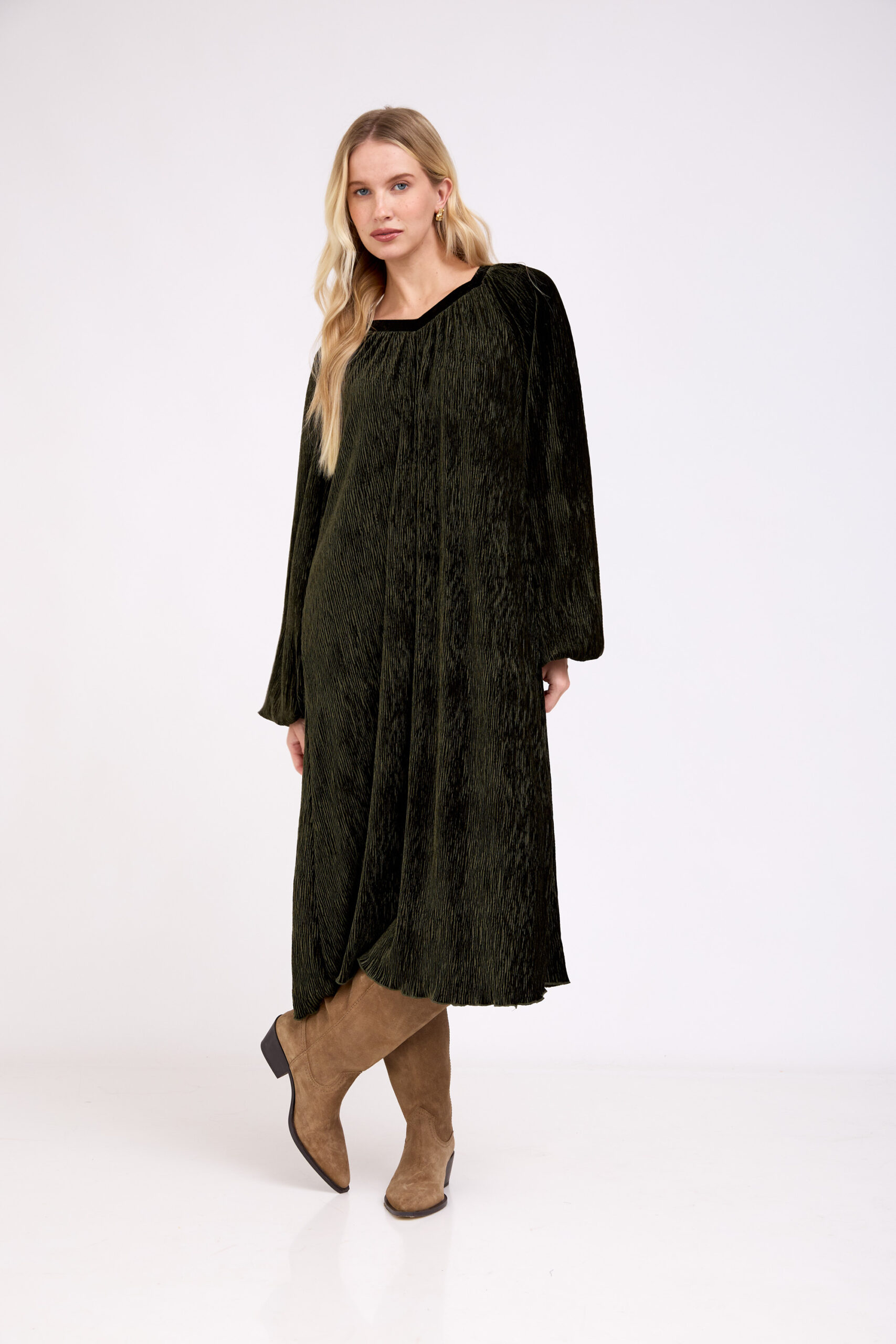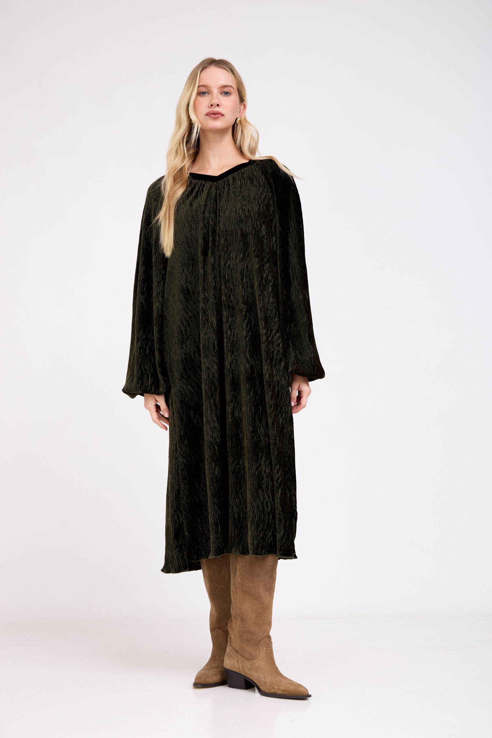 השמלה מתאפיינת בגזרת מידי מחמיאה עם דגש על טקסטורת קפלים (Pleated) עדינה לכל אורכה. המדגישה את המותן ומעניקה נפילה רכה ומרשימה לחלק התחתון.