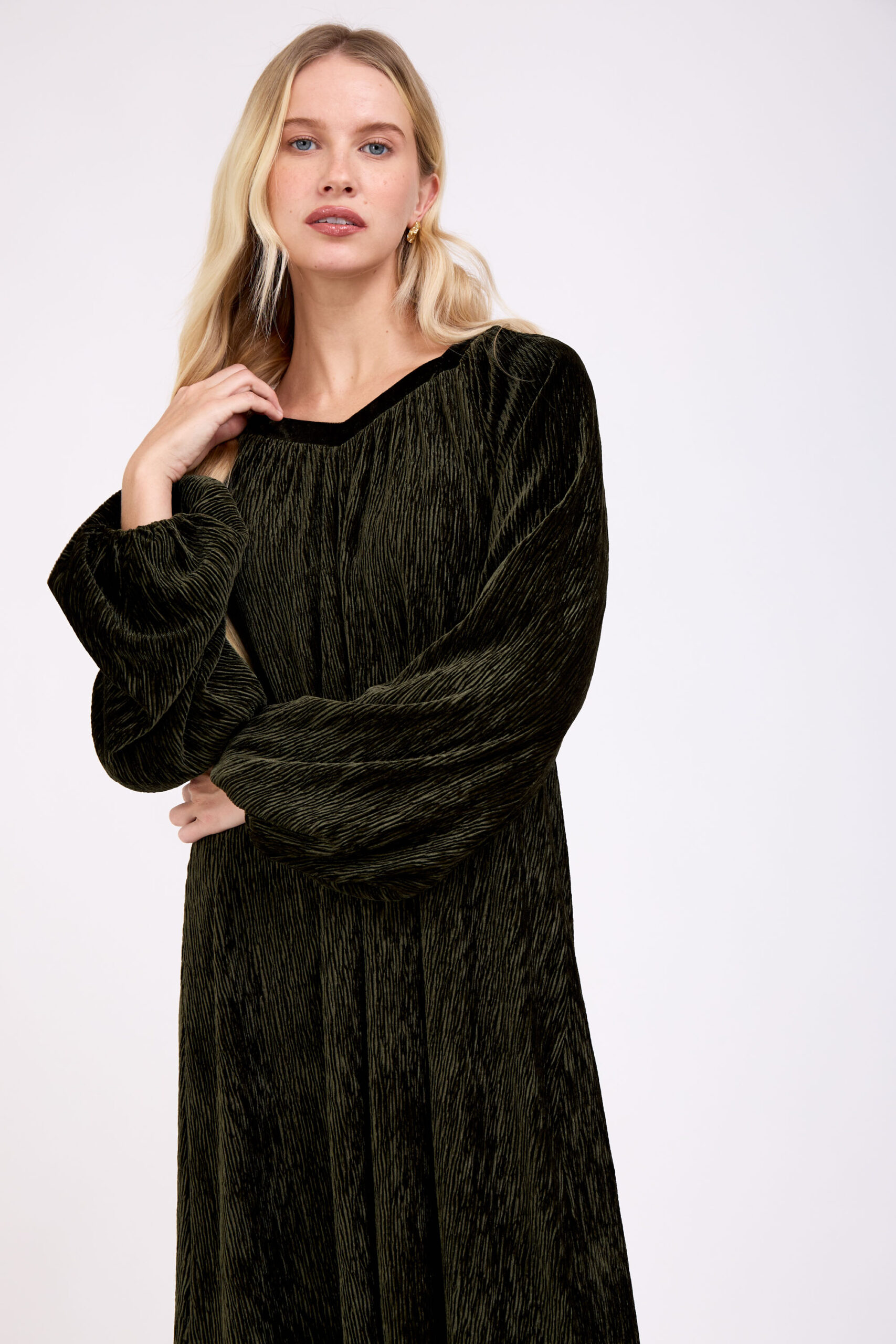 • צבע: גוון ירוק עמוק ואצילי, שמעניק לשמלה מראה יוקרתי ועל-זמני המתאים לכל עונות השנה.