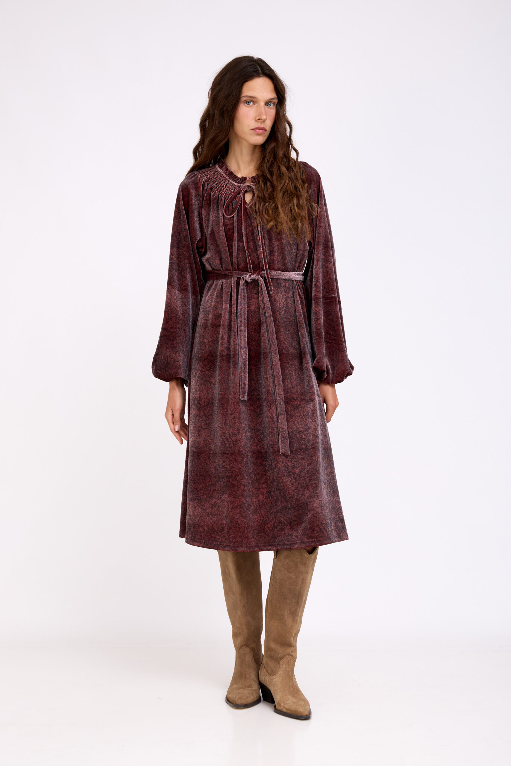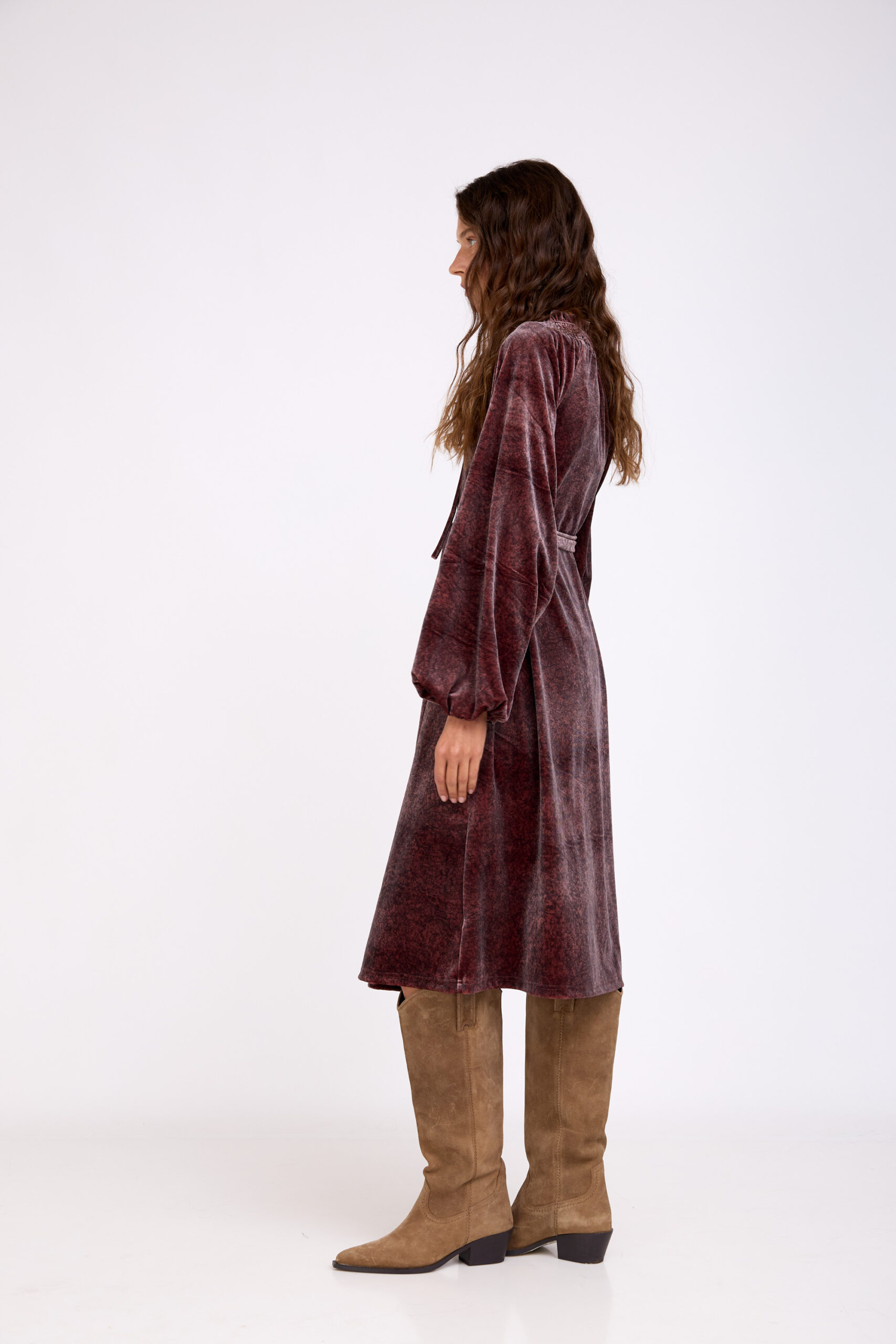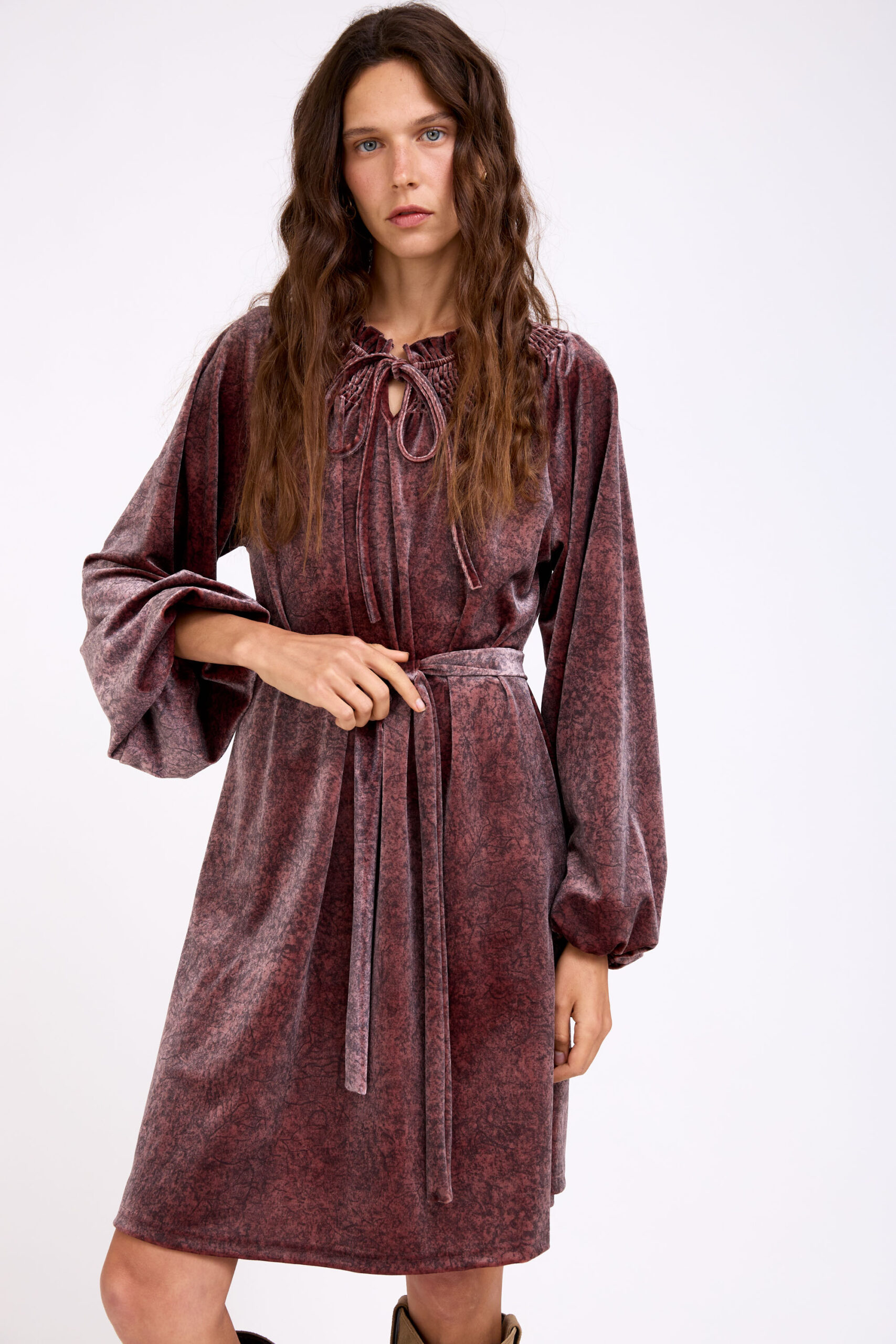 שמלת קטיפה רכה עם הדפס ורדרד שנותן נוכחות ואופי בלי להתאמץ.