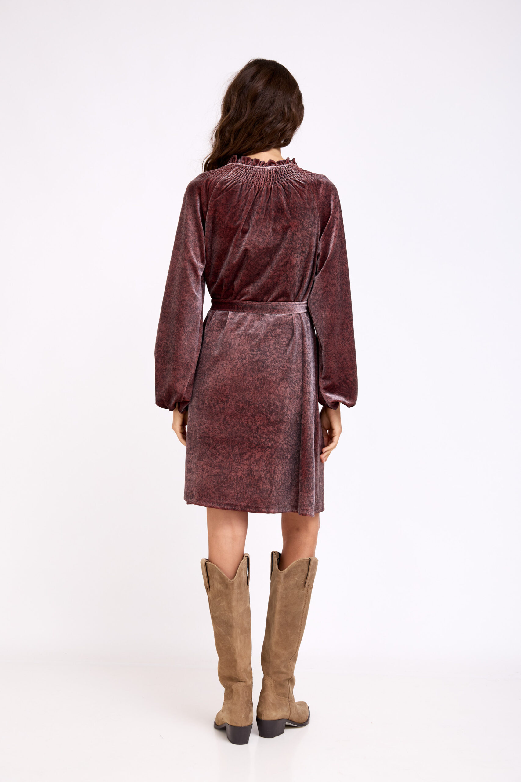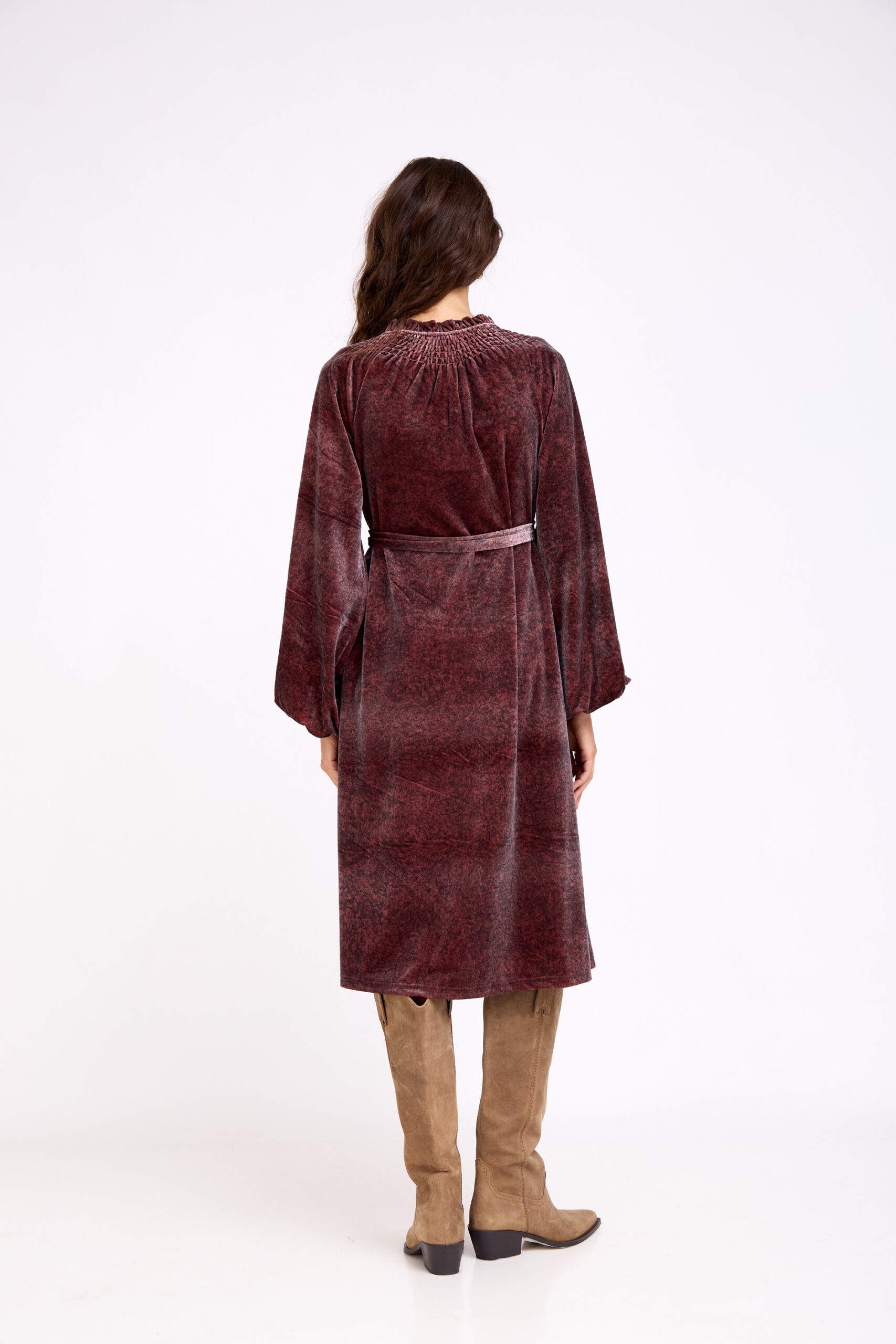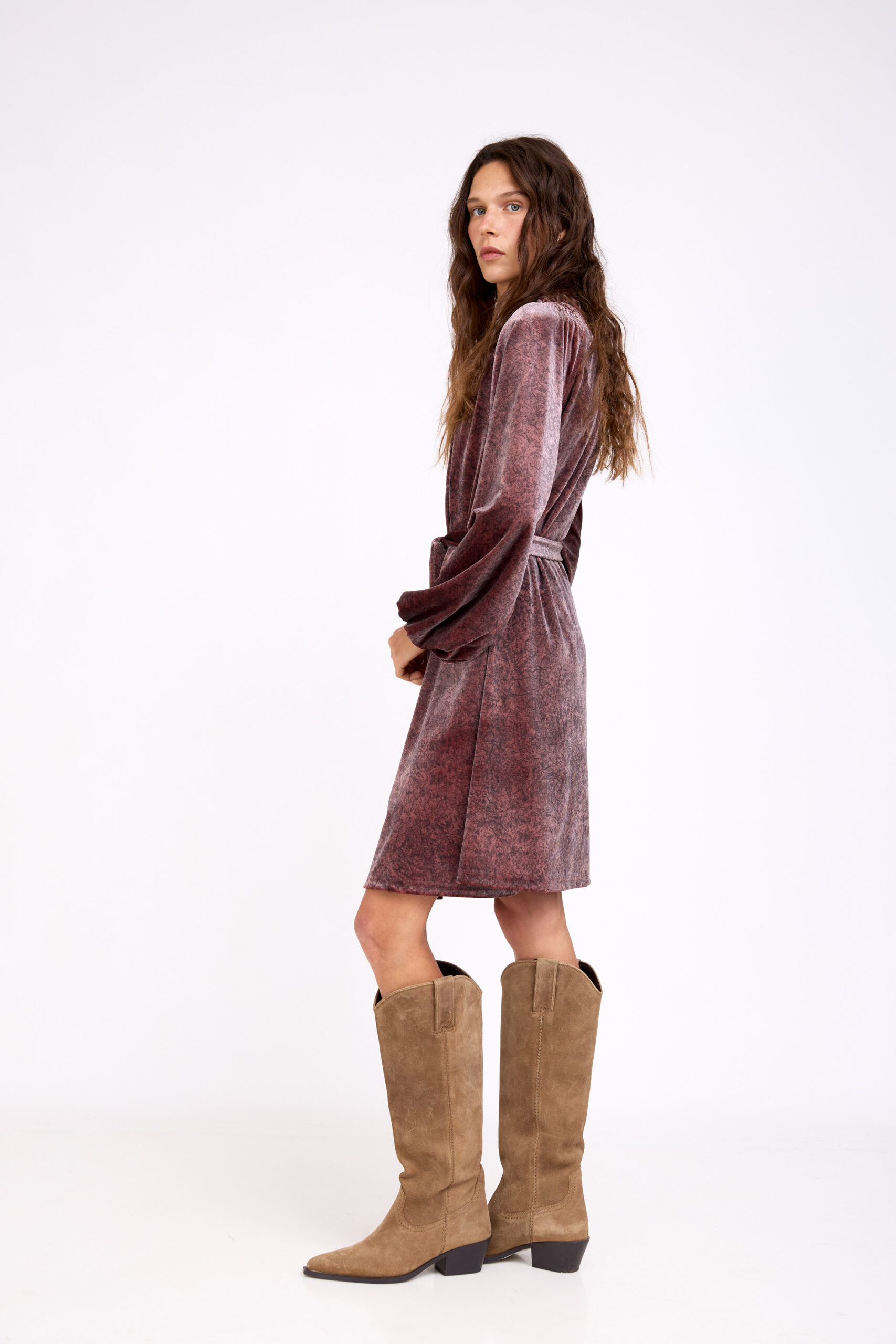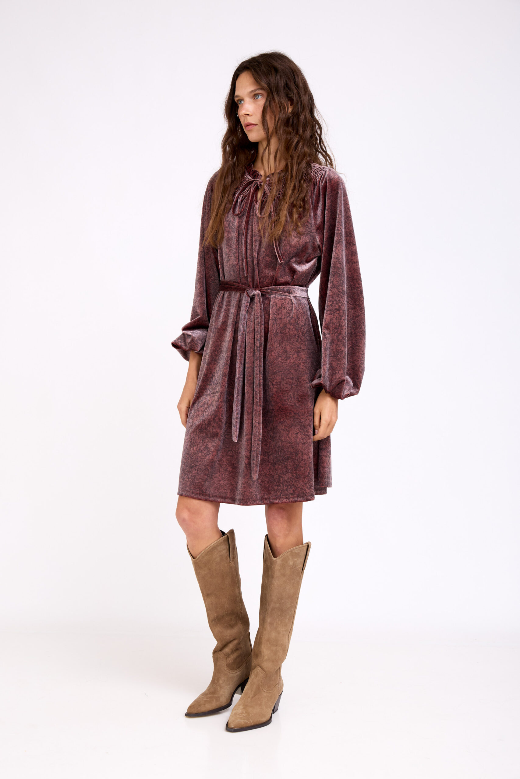 שמלת קטיפה רכה עם הדפס ורדרד שנותן נוכחות ואופי בלי להתאמץ.