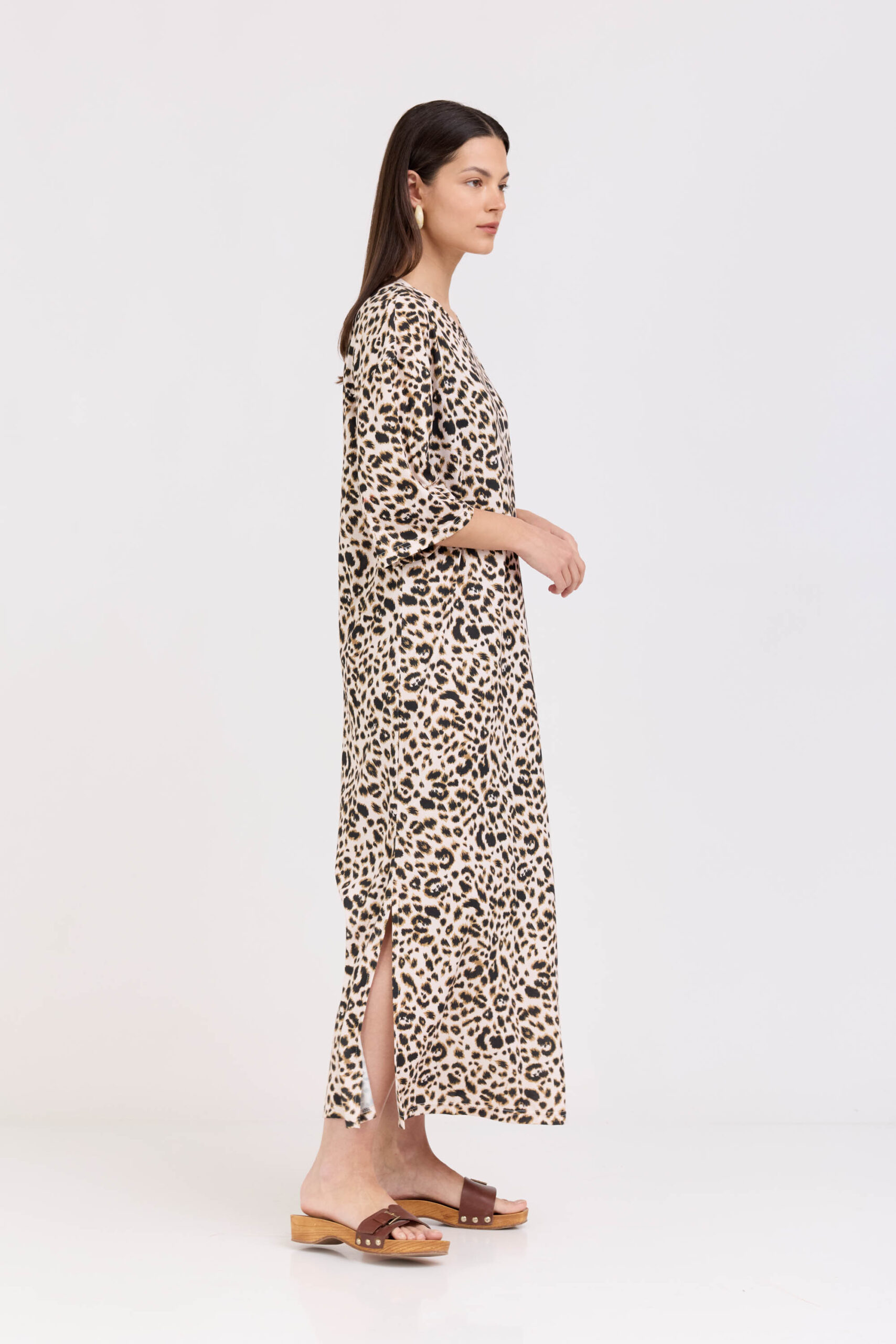 עם הדפס מנומר עשיר, צווארון עגול המעניק נגיעה נשית ומחמיאה.