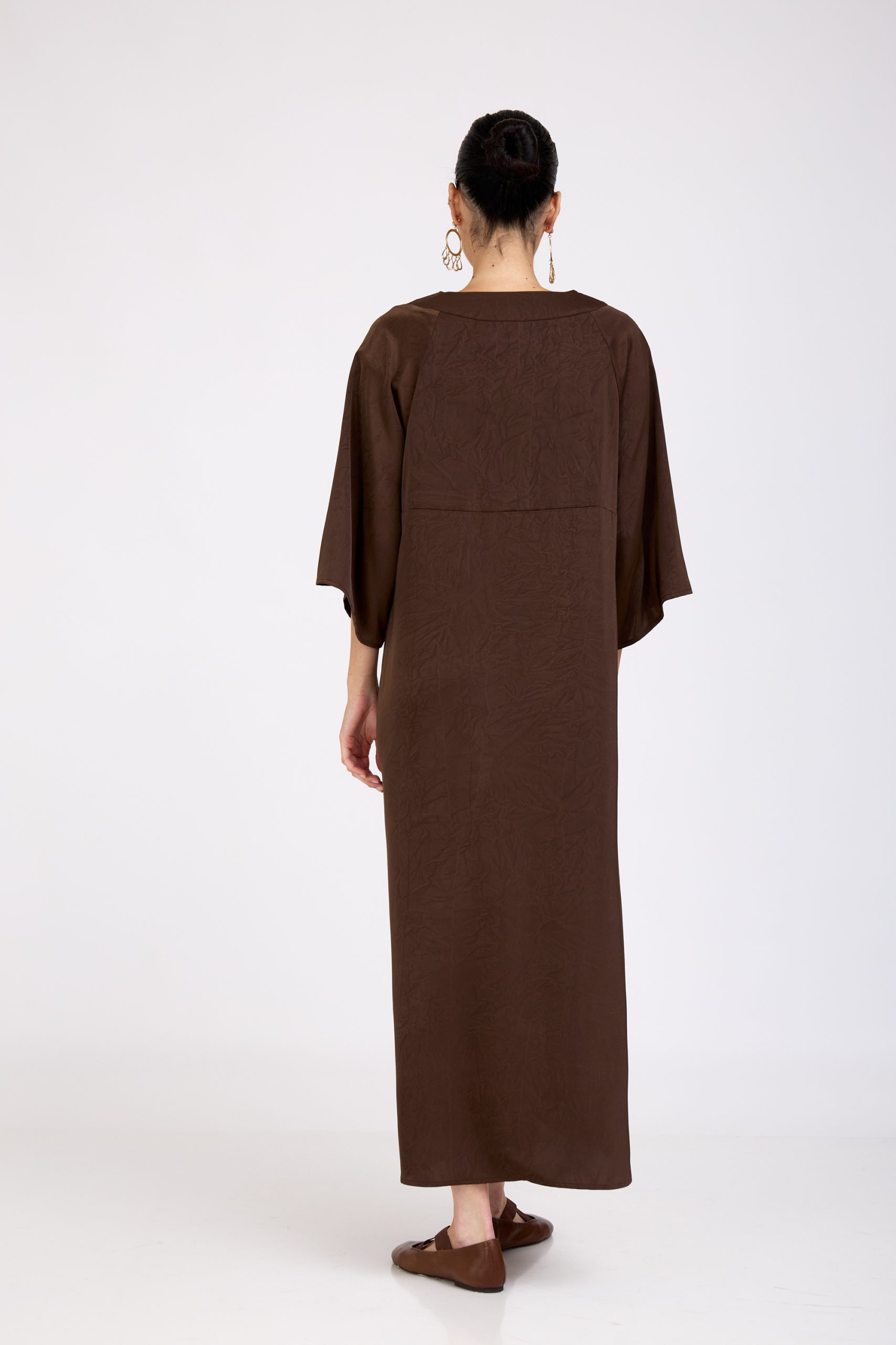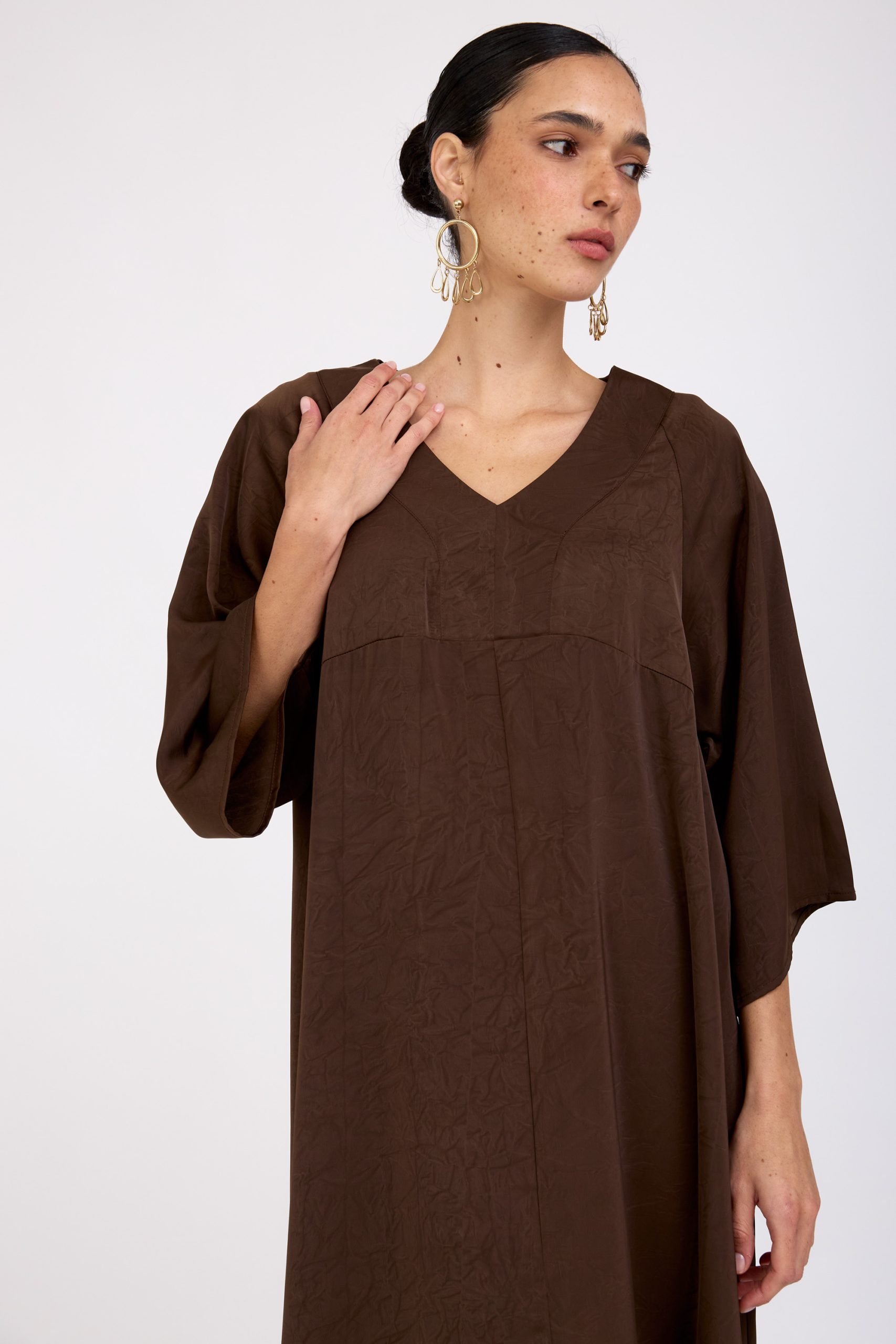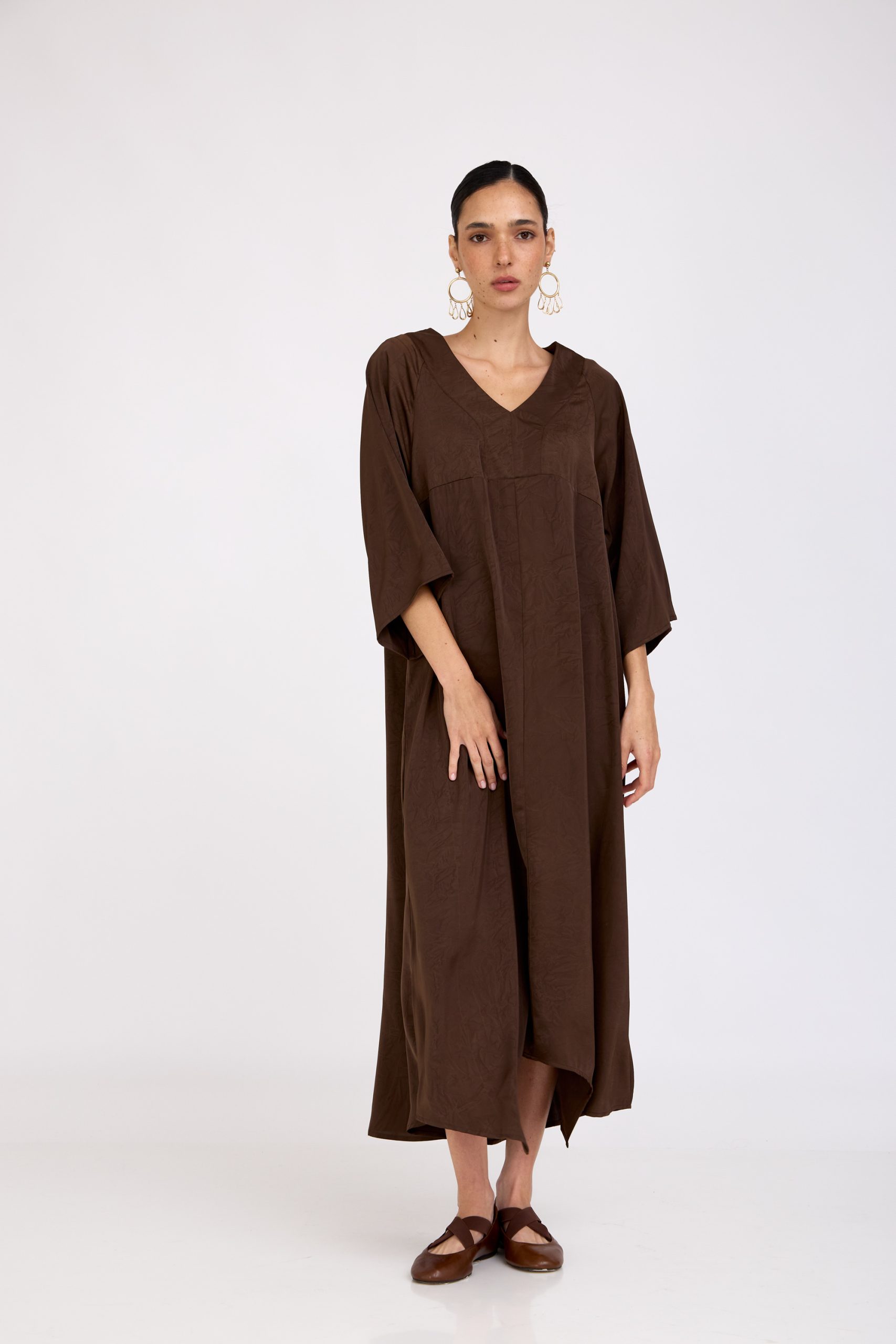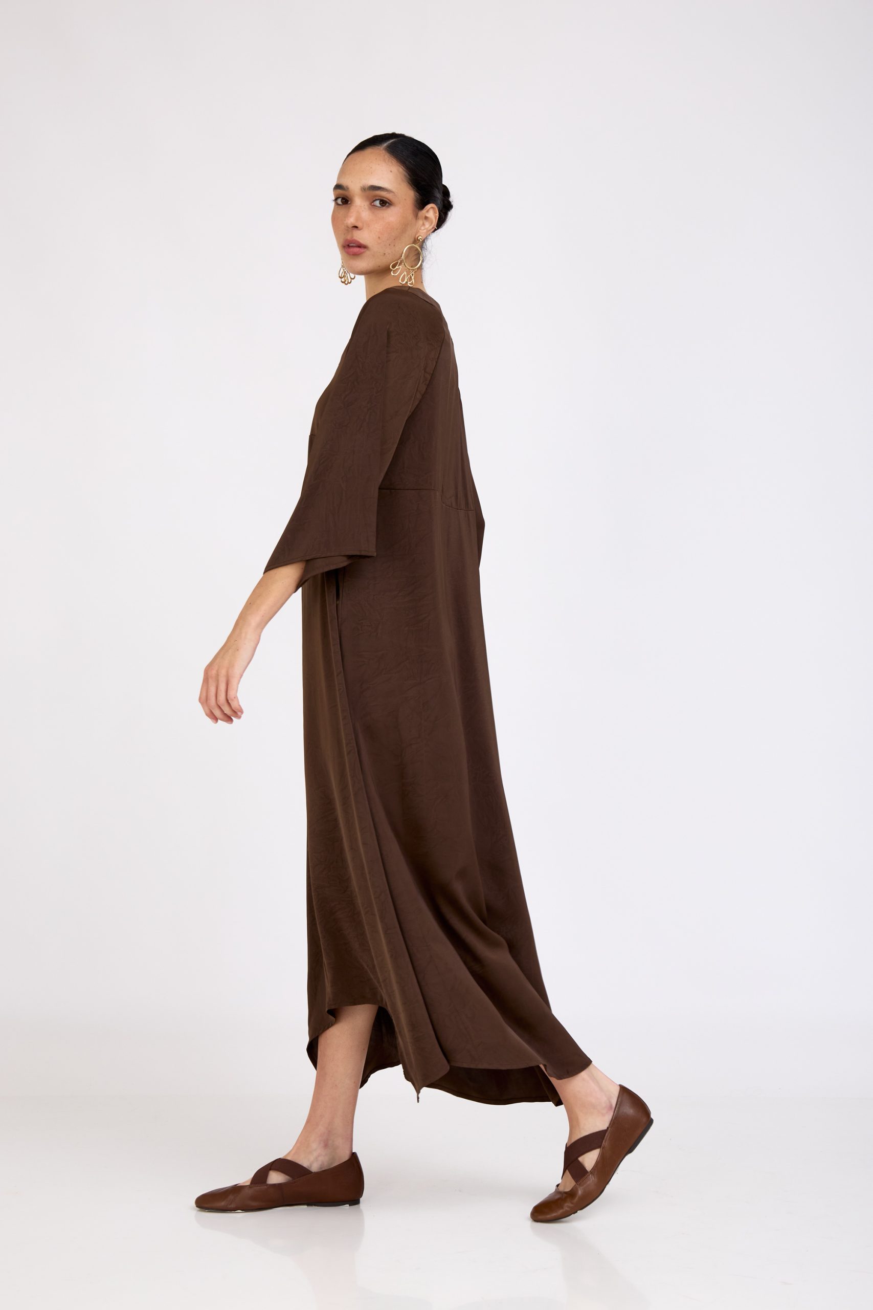 שמלת מקסי חגיגית בגוון שוקולד עמוק, עם בד בטקסטורה מקומטת ייחודית- למראה יוקרתי ומעודן. הגזרה נשפכת ומשוחררת ועם סיומת א-סימטרית אצילית ויפה במיוחד!