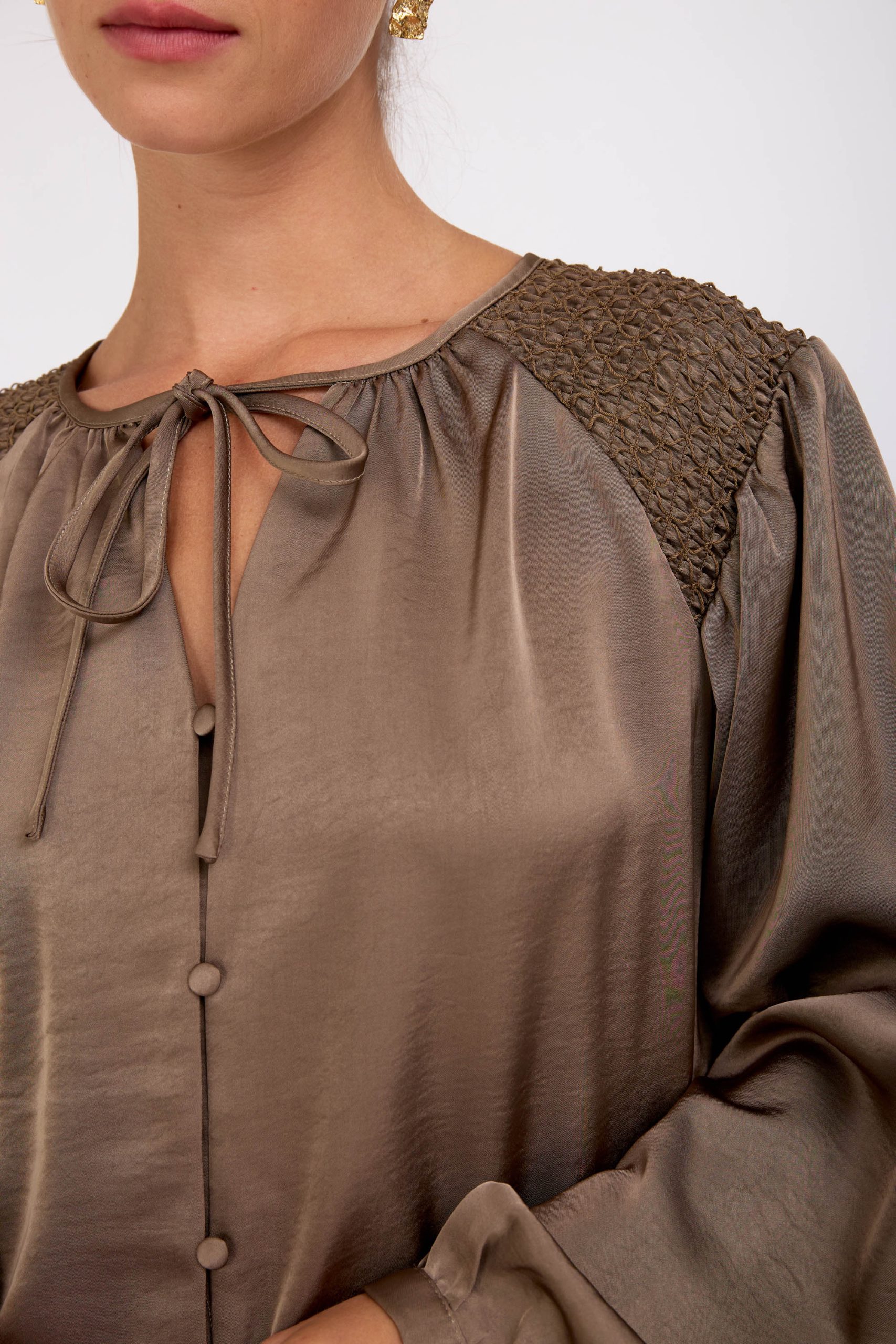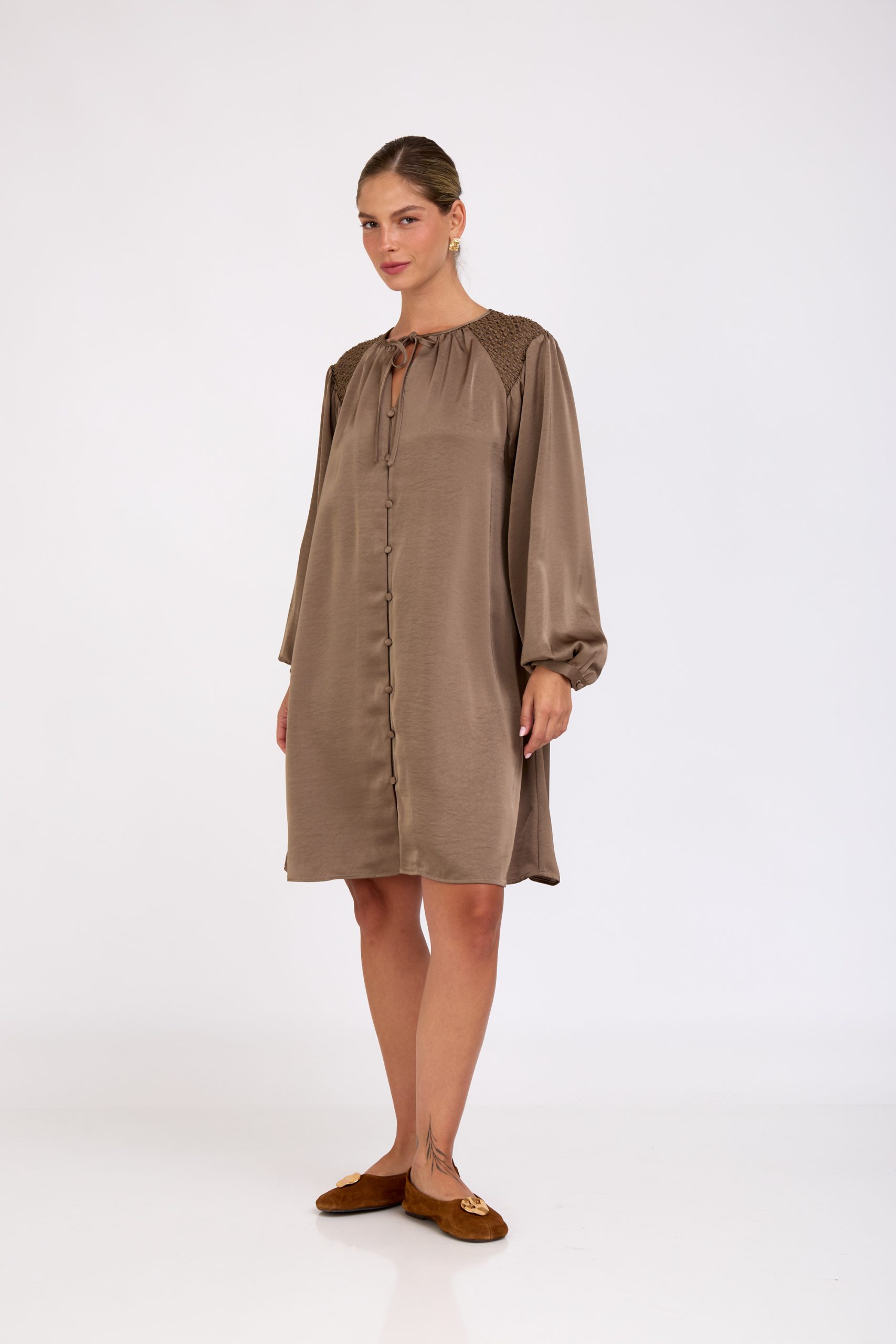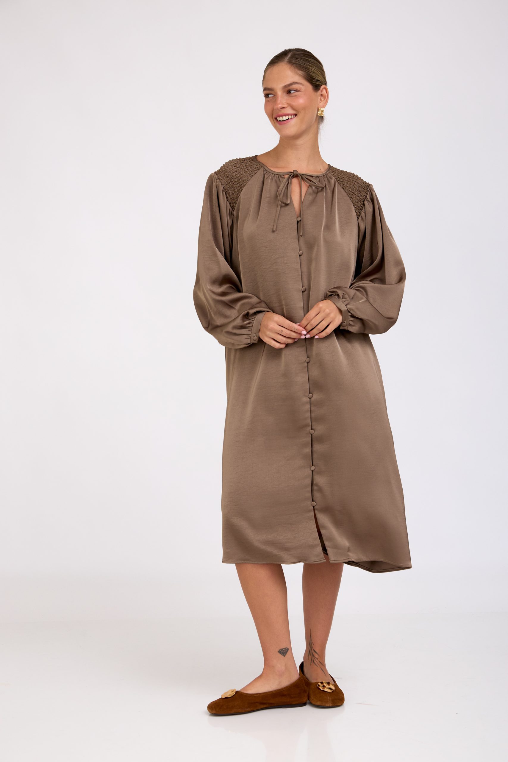 גזרה נשפכת עם שרוך קשירה בחזית וכפתרה מלאה למראה נשי וקלאסי.