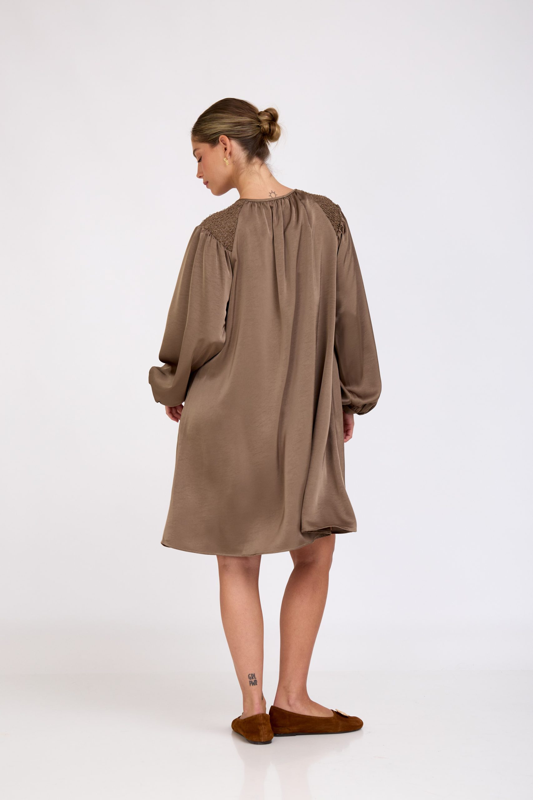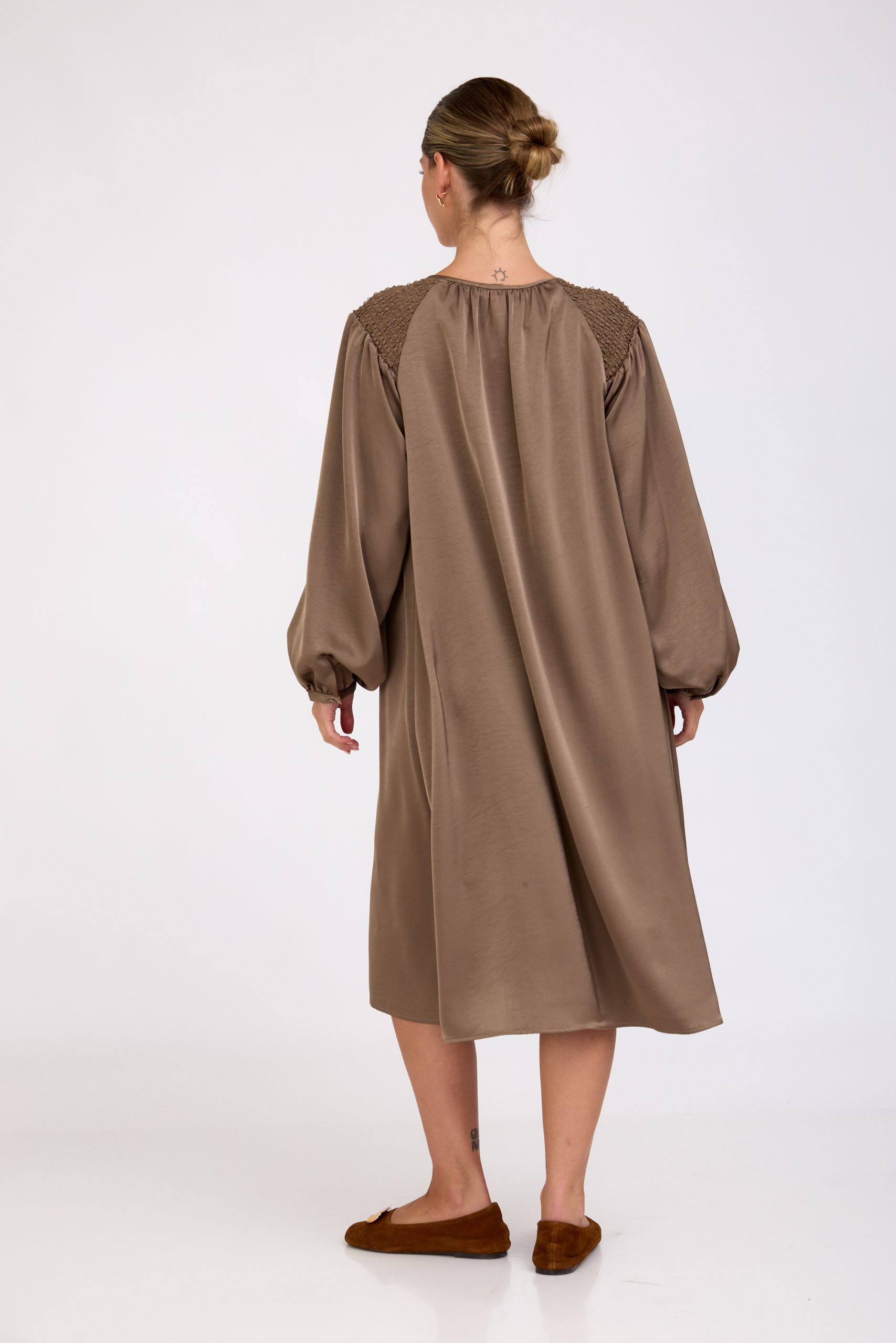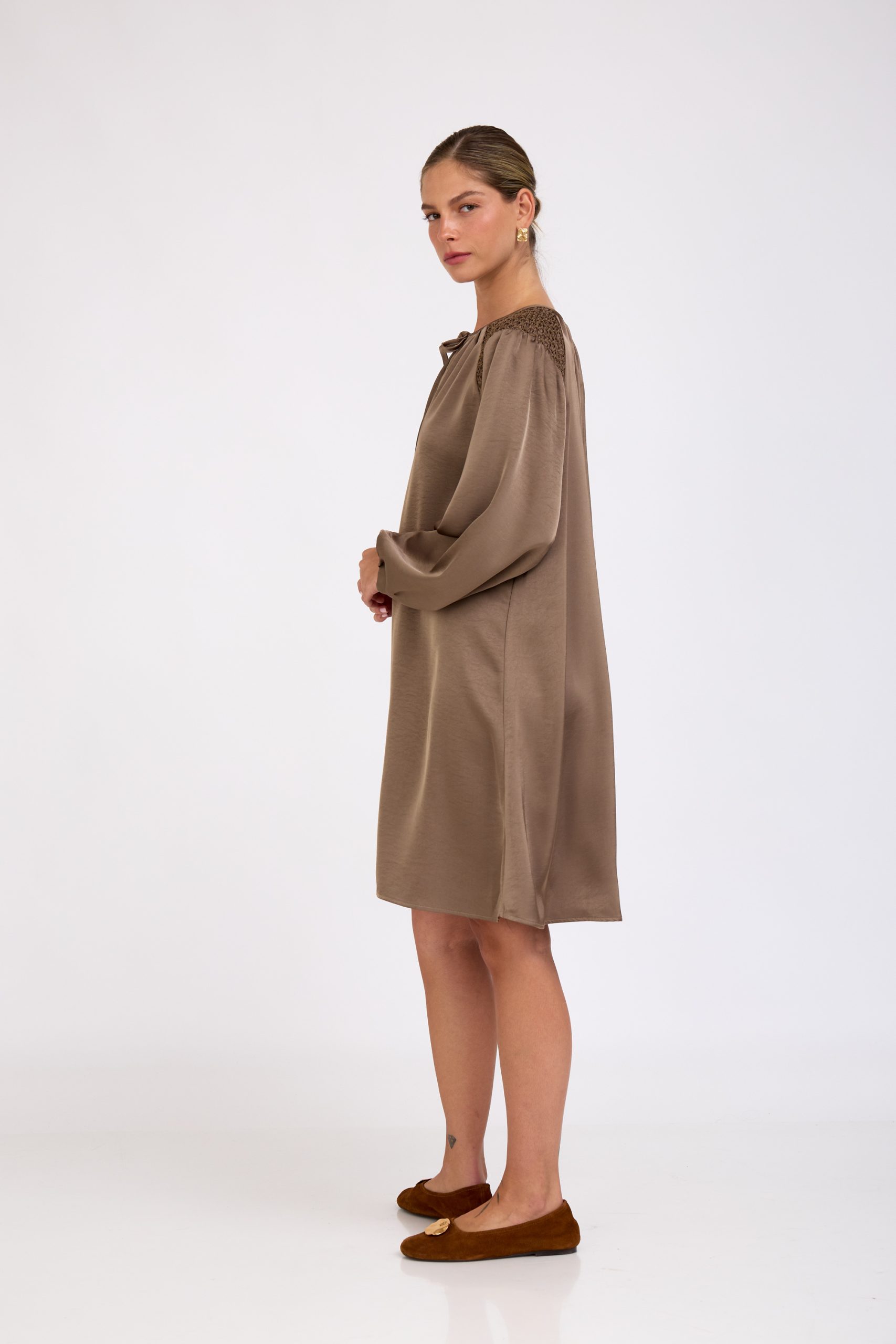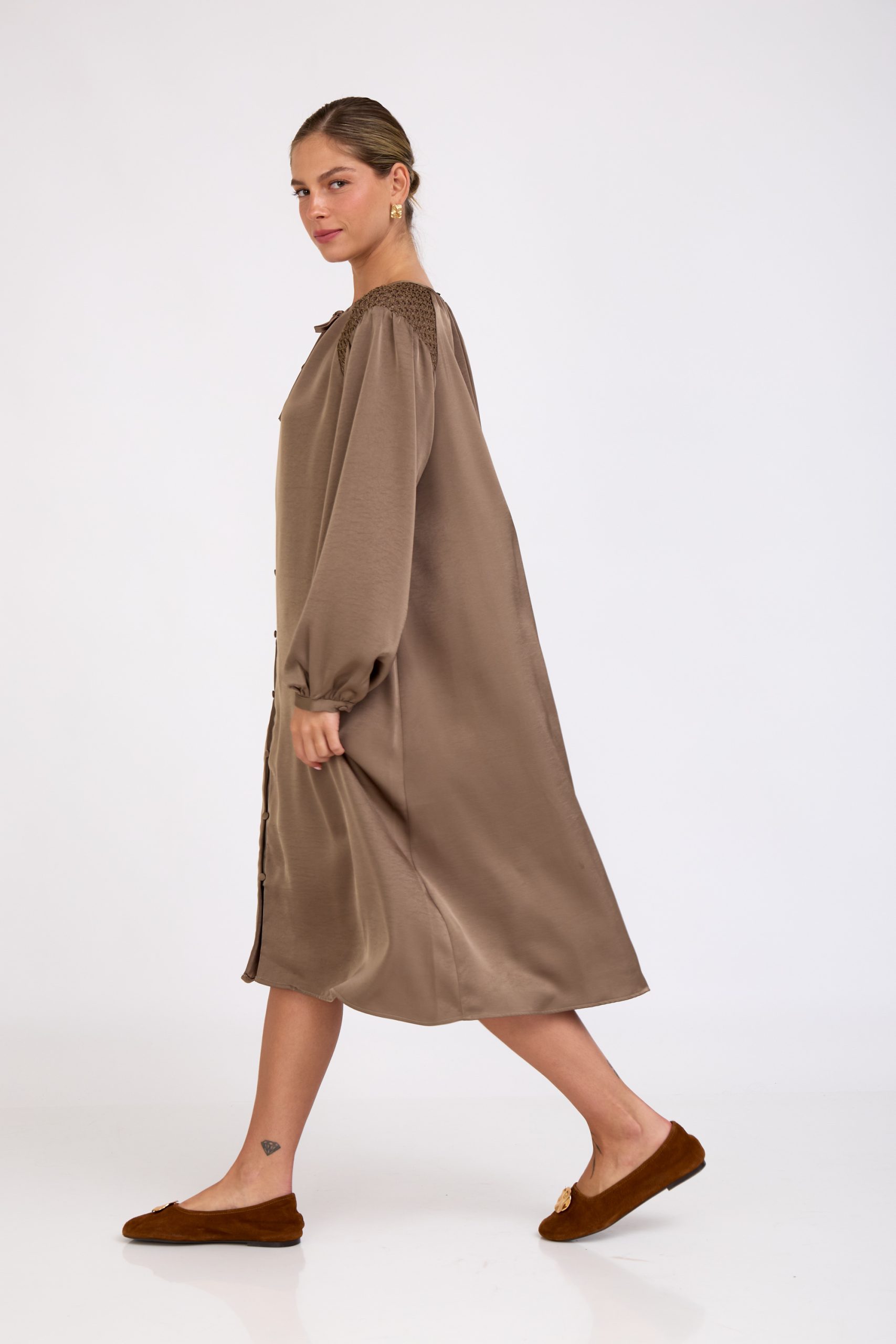 גזרה נשפכת עם שרוך קשירה בחזית וכפתרה מלאה למראה נשי וקלאסי.